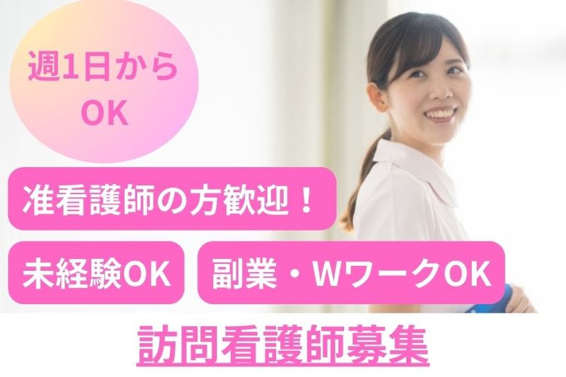【応募資格】 ■下記ご資格をお持ちの方 ・正看護師 ・准看護師 訪問看護が初めての方、ブランクのある方にも丁寧に指導いたします 【メリット】 #週1日からOK #副業・WワークOK #平日のみOK #土日祝のみOK #40代も応募可 #50代も応募可 #60代も応募可 #経験者歓迎 #ブランクOK #有資格者歓迎 #社会保険完備 #車通勤OK #交通費支給 #駅近5分以内