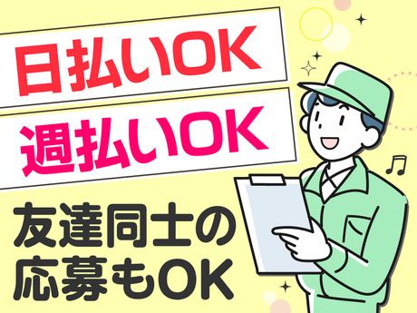 【保険制度】 雇用保険、労災保険、健康保険、厚生年金 待遇・福利厚生 【福利厚生】 *社会保険完備(法令) *交通費支給(規定有) *日払い・週払いOK(規定有) *入社祝い金5万円(規定有) *昇給制度 *派遣先への正社員登用実績あり