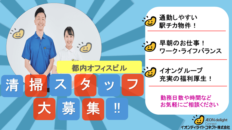 面接確約・イオングループの福利厚生制度あり|主婦(夫)・フリーター活躍中|都内オフィスビル(千代田区)の清掃スタッフ|アルバイト・パート|関東支店