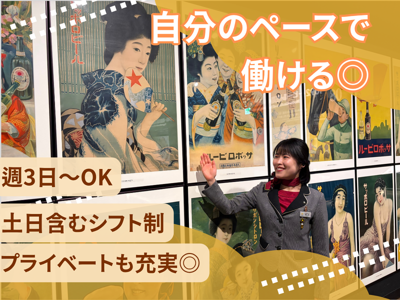 仕事内容 ✨週3日~OK・オシャレな制服あり◎ ✨\ビール好き&接客好きに人気/ミュージアムでのご案内! ✨歴史あるビール博物館×体験型施設で“特別感のあるお仕事” ✨【未経験OK】SV常駐で安心サポート◎ ✨朝ゆっくり10:15スタート&実働7.5時間! ✨20代~40代女性中心に活躍中! ◆今回お任せすることは… ビール博物館に来場されたお客様へ ツアーガイドやご案内を行うお仕事です\(^o^)/ ▽具体的に… ・ミュージアムツアーのガイド業務 ・受付、カウンター対応 ・展示コーナーの巡回 ・電話対応(1日平均10件未満) ・事務所内でのお問い合わせ対応 \ 未経験歓迎◎ / 接客スキルを身につけながら成長できるお仕事です! 研修やサポート体制が整っており、 慣れるまでしっかりフォローしますので安心してスタートできます♪ 《 求人の魅力 》 🍀歴史あるビール博物館で働ける特別感 ⇒1876年から続く歴史をお客様に伝えるやりがいあり 🍀落ち着いた館内で丁寧な接客ができる ⇒慌ただしさ少なめ◎ゆとりをもって対応できます 🍀未経験でも安心の研修&サポート体制 ⇒SV常駐&チーム制でフォロー充実 🍀週3日~OK!ライフスタイルに合わせて働ける ⇒プライベートとの両立も◎ 🍀朝ゆっくりスタートで働きやすい ⇒10:15始業で通勤ラッシュ回避 🍀女性が多くなじみやすい職場環境 ⇒20代~40代中心で和やかな雰囲気 難しい作業はありません! 未経験の方でも安心してスタートできます◎ 《 こんな方におすすめ 》 *人と接することが好きな方 *ガイド・接客のお仕事に興味がある方 *未経験から新しい仕事にチャレンジしたい方 *落ち着いた環境で丁寧な接客をしたい方 *チームで協力しながら働きたい方 *週3日程度で無理なく働きたい方