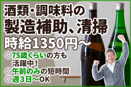 仕事内容 ■酒類・調味料の製造補助・清掃スタッフ募集<<70代の方まで幅広く活躍中>> 日本酒や調味料の製造を支えるお仕事です! 主な作業は、酒を搾った後に残る酒粕(さけかす)を剥がして回収する作業や清掃作業です。 難しい作業や力作業はないのでご安心下さい! シンプルな作業なので未経験でも無理なく初めて頂けます! 今いるスタッフも未経験から始めた方が多数! 年齢層も幅広く、70代の方も活躍中の職場ですよ!