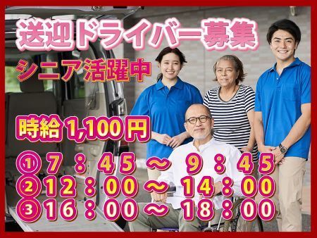 PR 新しい施設のオープンのため、募集を行っています 【施設の紹介】 ・1日型または半日型のデイサービス施設 ・施設内では、運動機能を高めるトレーニングをご利用様に提供 【お仕事内容】 ・デイサービスの施設とご利用者様のご自宅の送迎 (お仕事の流れ) L朝便 出勤→送迎ルートの確認→ご自宅にお迎え(3~5件)→終了 L昼便 出勤→送迎ルートの確認→デイサービスからご自宅に送迎 午後の利用者様のお迎え→終了 L夜便 出勤→送迎ルートの確認→ご自宅に送迎→終了 介護施設での送迎経験は、不要です 丁寧なお仕事研修でサポートします