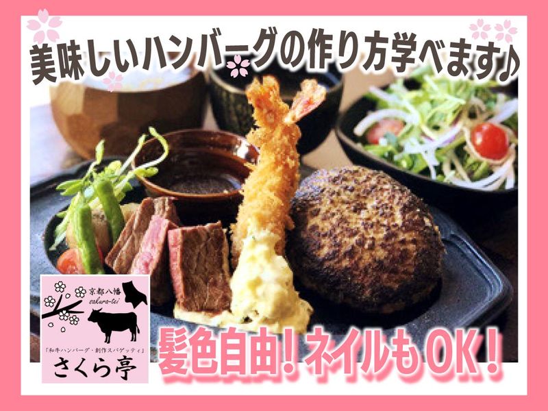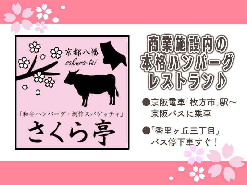 仕事内容 【手作り和牛ハンバーグのお店「さくら亭」で店舗スタッフ大募集!】 自慢の本格手作りハンバーグをお客様へご提供いたします。 ●ホール業務…料理の提供やお席へのご案内など ●キッチン業務…カンタンな盛付や洗い場など 桜をモチーフにした素敵な店内♪ 自由度の高いシフトで、仕事仲間も幅広い層が活躍中の環境です。 未経験OK♪ 大学生、専門学生、高校生、バイトデビューの方や、パートさん、フリーターさん、大歓迎! 覚えて頂きやすいよう、しっかり丁寧にサポートいたします! 和気あいあい、落ち着いた雰囲気の中でオシャレに働けます♪ ☆働きやすさピカイチ☆ ☆自由度の高いシフト☆ ☆洋食屋さんで働こう☆