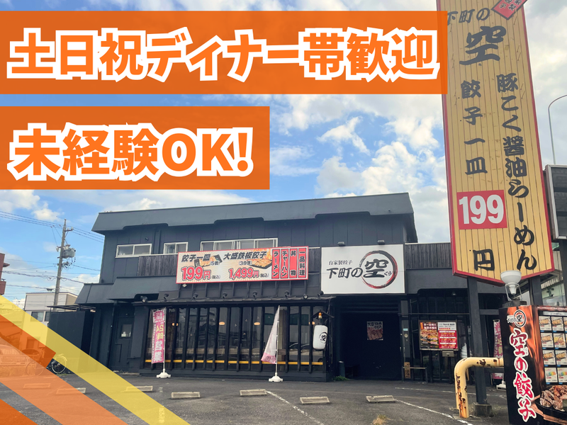 職場環境 【お店について】 下町の空(くう)は自家製餃子が 大人気のラーメン屋さん! カウンター、テーブル、お座敷の 全54席があり、ファミリー層を ターゲットにした清潔感のある店内で、 広々としていて働きやすい環境です! 喫煙所:喫煙所あり(屋外)
