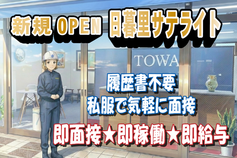 選考プロセス <応募方法> Indeed簡単応募または 電話応募よりご応募ください! (電話03-6240-6102) ~ 面接フロー ~ ① 応募 ↓ ② 面接(即面接も可) ↓ 勤務地付近の営業所で面接実施 ↓ ※面接時は履歴書不要 ↓ ※普段の服装でいらして下さい ③ 採用 ↓ 面接場所近くの病院で ↓ 健康診断受診(無料) ④ 勤務開始 ※防具の貸出あるので 最短で翌日勤務可能! 道に迷った時はお電話下さい。 面接地までナビ致します。 ※出張面接可(要相談) 【面接地・登録地】 株式会社東和コーポレーション 日暮里サテライトオフィス 所在地:東京都台東区根岸2-21-12 ホリビル1階101号 担当者:採用担当 中丸 電話番号:03-6240-6102 メールアドレス:nippori@to-wa.co.jp ※近隣営業所(北千住・秋葉原・錦糸町)で面接・登録も可(ご相談ください)