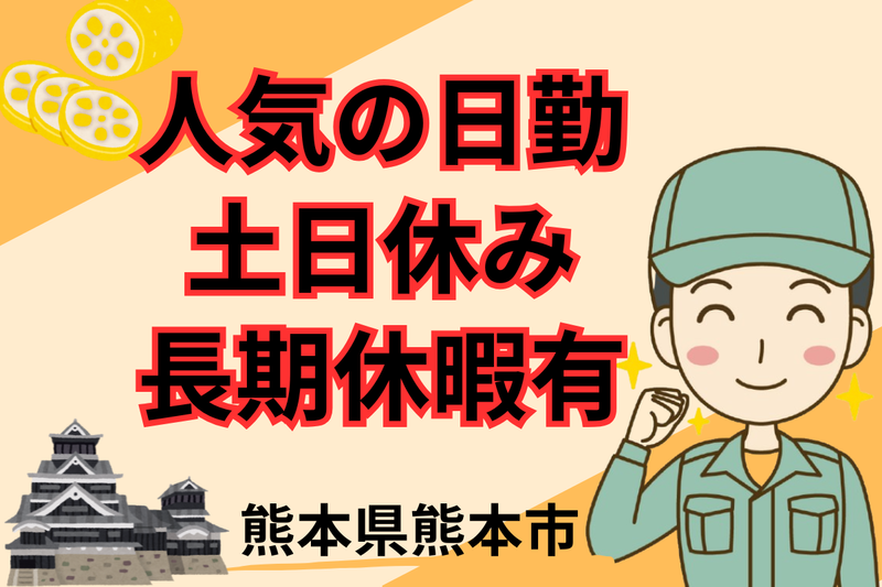 仕事内容 《 ここがポイント! 》 ●未経験歓迎! ●日勤&夕方に帰宅可! ●基本土日休み! ●シンプル業務&作業に集中できる環境 ●日払いOK!食堂・休憩室あり! 熊本市内に位置する 宇宙・防衛関連まで手掛ける 電気工業会社で検査業務をお任せします。 - 《 主な業務 》 お客様からお預かりした 製品の検査業務をお任せします。 ▼具体的には… ・製品の明るさや明暗の差をチェック ・専用ソフトを用いた簡単な検査作業 ・製品の移動や機械へのセット作業 など ※立ちっぱなしではなく、 歩いたり軽く体を動かす作業もあるため、 ずっと同じ姿勢にならず、 体への負担が少なめです。 入社後は教育研修があるので、 業務の流れやコツ、注意点なども しっかりレクチャーします! 《 仕事のポイント 》 コツコツ・黙々と 進める作業が好きな方にピッタリ! 学歴・経験は一切不問。 PC作業もカンタンなので、 未経験からでも安心です。 また、エヌエス・テックの社員が ほぼ毎日就業先へ訪問しているので、 仕事や人間関係の悩みを気軽に相談OK! 派遣先との間に立ち、 問題解決をサポートします。 責任を一人で抱え込まなくてOKです。 - 《 スタッフの特徴 》 20代・30代・40代の世代の 男性スタッフが活躍しています! 開発が進む熊本市内の 工場が勤務地のため、 地元や近くで働き続けたい方も 普段と違う場所で働きたい方も どちらの方も歓迎しています。 ▼そのほか… 当社はフルタイムで 長く働ける環境を用意しています。 もし工場が縮小した際も次の職場を案内し、 収入UPや日勤希望などの異動もサポート! 正社員登用の道もあり、 合わなければ異動も可能です。 安定して長期就業できますよ。