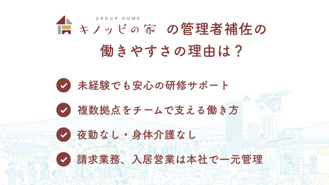 仕事内容 グループホームの運営に関わる仕事に、興味はありませんか? キノッピの家では、 障がい者グループホームの世話人(管理者補佐)を募集しています。 資格や経験は問いません。 福祉の仕事が初めての方でも、 スタッフや本社と連携しながら 安心してスタートできる環境です。 \働き方の特徴/ ・定員4〜7名の少人数ホーム ・夜勤なし・身体介護なし ・請求/採用/事務は本社が対応 ・複数拠点を巡回する働き方 ・直行直帰OK ・残業はほぼありません ホームの運営を支えながら、 利用者様が安心して暮らせる環境を スタッフと一緒につくっていく仕事です。 \キノッピの考え方/ 私たちは「サポート」を大切にしています。 利用者様のできることを増やし、 地域の中で生活を続けていけるよう支えること。 それがキノッピの家の支援です。 \こんな方に向いています/ ・人の話を聞くことが好きな方 ・福祉の経験を活かしたい方 ・チームで支援を考えたい方 ・年齢に関係なく長く働きたい方 ・ブランクがあり、もう一度福祉に関わりたい方 \代表メッセージ/ 福祉の仕事は、専門職だけで完結するものではありません。 地域の中に少しずつ「関わる人」が増えていくことで、 やさしい社会は広がっていくと考えています。 この仕事は、 管理者と一緒に利用者様の暮らしを支えるホームの環境を整え、 スタッフや地域とつながりながら支援を支えていく大切な役割です。 利用者様が地域の中で安心して暮らし続けられるよう、 チームで支援を考えながらホーム運営を行っていきませんか。 私たちと一緒に、 やさしい街づくりに参加していただけたら嬉しいです。 ご応募を心よりお待ちしています。 【仕事内容】 茨城県内にて複数展開している軽度障がいのある方向けの個別サポート付き住宅「キノッピの家」の運営と生活支援を行う仕事です。 管理者とともに入居者やスタッフ、関係機関と連携しながら、ホーム全体を支える役割を担っていただきます。 ※将来的に管理者にステップアップしたい方向けのポジションです。 具体的には ・入居者からの生活相談対応 ・日常生活に関する支援や助言 (服薬管理、金銭管理、通院サポートなど) ・世話人スタッフとの情報共有 ・支援状況の確認や調整 ・ご家族や相談支援専門員、医療機関との連携 ・支援記録や報告書などの事務業務 ご自宅から一番近いホームに出勤し、 1日4〜5拠点ほどを巡回していただきます。(直行直帰OK) 入居者様の日々のお困りごとの 相談役・サポート役としてご活躍いただきます 【福利厚生】 ・社会保険完備(雇用保険、労災保険、健康保険、厚生年金) ・昇給あり ・マイカー・バイク・自転車通勤可(無料駐車場あり) ・服装自由、髪型自由 ・退職金積立制度あり 【教育体制・研修】 管理者になるための研修制度、 先輩スタッフがしっかりサポートします! 障がい福祉の研修受講自由!未経験の方でも学びながら就業可です。 【休日】 週休2日 月1シフト提出 年間休日120日以上 シフト制 完全週休2日制 年間休日120日(月10日休み) ※月に3日まで希望休の申請が可能! 長期休暇も事前にご相談いただければ調整します。 ご家庭やプライベートと両立がしやすく長く安心して働けます♪ <長期休暇・特別休暇> ・有給休暇 ・慶弔休暇 ・夏季休暇