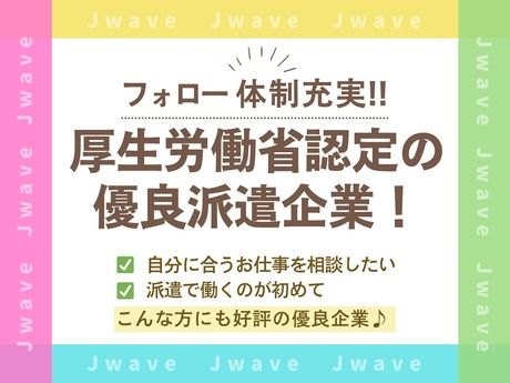 仕事内容 ■お仕事内容■ 仕事内容('ω')ノ コンビニやスーパーで見たことがある食品袋の印刷のお仕事です! 空調完備なので気温を気にせず快適に働けます!! 千葉県匝瑳市、東庄町、旭市、多古町、銚子市 茨城県神栖市からも通勤が可能です! ■職場のポイント■ 異業種の方も活躍中★ <Point1>安くておいしい食堂あり! <Point2>空調完備で快適作業! <Point3>旭駅から無料バスあり! ほかにも気になることがあれば、いつでもご相談くださいね♪ ■直接話を聞きたい方は下記番号までお電話を!!■ 0476-85-6157 採用担当宛 まで お気軽にご連絡下さい。 ■選べる!対面orWEB面接!■ 【対面】 面接地:成田支店 千葉県成田市花崎町800-6 丸喜ビル5F 「京成成田駅」徒歩5分の駅チカ! 【WEB面接】 自宅などお好きな場所で、PCやスマートフォンなどから面接を受けることができます! 応募から最短2日~お仕事スタート可能♪ 応募より1~2営業日以内に、お電話・メールにてご連絡致します◎ ★ご好評につき、募集枠が残りわずかです。 ⇒今すぐエントリーを! ■株式会社ジェイウェイブは…■ ◎長期安定!スピード面接&入社も可能! ◎厚生労働省認定の優良派遣企業 ◎長期で安定して働けるお仕事をお探しの方にピッタリ!