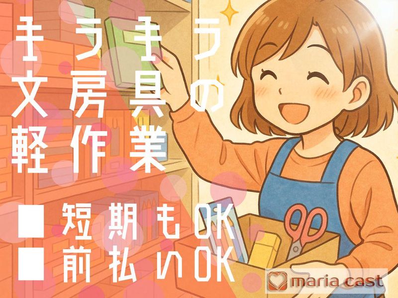 仕事内容 ☆…☆…☆…☆…☆…☆…☆…☆…☆…☆…☆… 働き方を自分で選べるから!\最高!/ 〇選べる【働く時間】! ・・・時間帯は3つから選択可能! 〇選べる【働く期間】! ・・・長期間でも、3-6カ月の短期間でも、「働いてから決める!」でもOK! 〇選べる【働く日数】! ・・・週3日、週4日、週5日から選べます!「今週は週4日、来週は週3日」みたいな働き方もOK! 自分のペースで働けるから、急な予定変更にも柔軟に対応できて超ラク! 好きな時間に働いて、休みの日は思いっきり遊べる♪ プライベートとのバランスが取れるから、気楽に続けやすいデスよ◎ ☆…☆…☆…☆…☆…☆…☆…☆…☆…☆…☆… ■【取り扱うのは…見ているだけでワクワクする文房具たち】 カラフルなペン、かわいいノート、便利なデスクアイテムなど、日常を彩る文房具を扱います☆ 「これ使ったことある!」と思えるようなアイテムがたくさんあり、見ているだけでも楽しくなる職場です♪ ■【お任せするお仕事の内容】 お任せするのは、誰でもすぐに始めやすいシンプルな軽作業です☆ ・ピッキング作業 出荷伝票を見ながら、棚から商品を取り出していく作業です! 商品にはラベルが貼られているので、初めての方でも迷わず探せます! >>たとえば「赤いボールペン10本」「ノート5冊」といった指示に従って、一つひとつ確認しながら進めます♪ ・梱包・出荷準備 ピッキングした商品を丁寧に箱詰めし、破損がないように梱包! 最後に出荷ラベルを貼り、発送準備を行います☆ お客様の元に正確に届くよう、最終チェックの役割も担います! 取り扱うのは軽い商品ばかりなので、安心して取り組んでいただけます☆ ■【お仕事スタート!初日はこれをやってもらいます】 初日は現場作業からスタートではなく、まずは業務の流れやルールを理解することから☆ ・最初はデスクに座って説明を受けます! ハンディ端末の操作やピッキングの進め方を丁寧にお伝えします♪難しいことはないので安心してね☆ ・倉庫内のルールや注意点も説明! 安全に働くための基本をしっかりと教えます☆ ・実際の作業は研修後、先輩と一緒にスタート! 分からないことがあればすぐ聞けるから、少しずつ覚えていけば大丈夫♪ 「慣れるまで付き添ってくれたから安心だった」という声も多いです☆