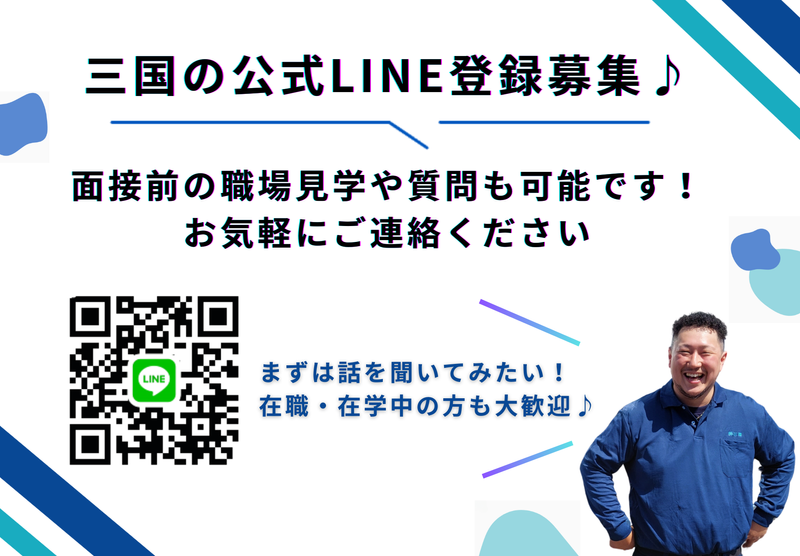 選考プロセス まずは「話を聞いてみたい」「見学だけ」でも大歓迎です。 ・職場見学OK ・電話での質問OK 電話:0776-81-3602(採用担当) <選考の流れ> ご応募 ↓ 担当者よりご連絡します ↓ 職場見学&面接 ◎まずは履歴書なしの見学も!お気軽にご応募下さい ↓ 面接1回 ↓ 2~3日後にご連絡します。 ★Instagramで(株)三国の日常を配信中★ 「(株)三国」で検索!