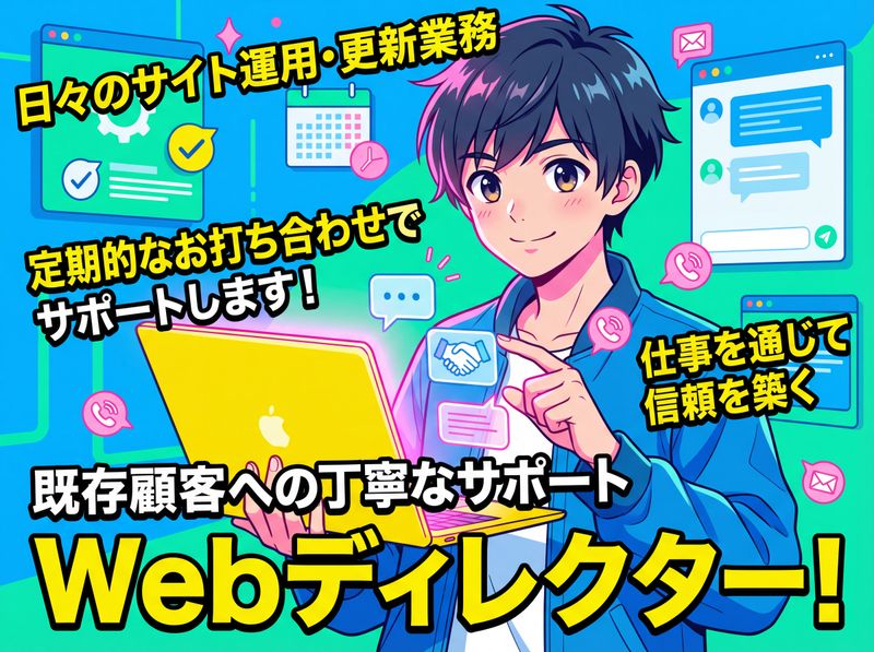 仕事内容: Webサイトを「作って終わり」ではなく、ユーザーに届けて、一緒に育てていくポジションです。コードで形にし、お客様の声を聴きながら、反応を見て「もっと良くするには?」を考える。色々な視点からWebに関わりたい方にぴったりです。 1. サイト構築 デザイナーとの完全分業制です。デザイン業務は一切発生しません。 ホームページの制作業務に集中できる環境です。 -サイト構築: WordPressを用いたサイトの制作 2. 運用保守 既存顧客の継続的なサポートを担当します。 -既存顧客対応: 定期的な打ち合わせ、日々の連絡・サポート業務、サイト更新対応 3. データ分析 制作したWebサイトをデータを使って改善します - 運用改善: Google Analytics・Search Console等を活用し、検証・改善を行う 最初から全部できなくて大丈夫です。まずはあなたの「得意なこと」からスタート。焦らず自分のペースで、少しずつできることを増やしていきましょう。 入社からの1ヶ月は、先輩との「ペアワーク」が中心になります!まずは一緒に画面を見ながら、実際の作業を一つずつ体験してみましょう。困ったときはその場ですぐにフォローするので、間違えても大丈夫です。 まずは「できた!」という手応えを一緒に楽しみましょう。 ※上記3つがメインの業務ですが、社内の状況に応じて他部門のサポートや庶務的な作業をお願いする場合もあります。
