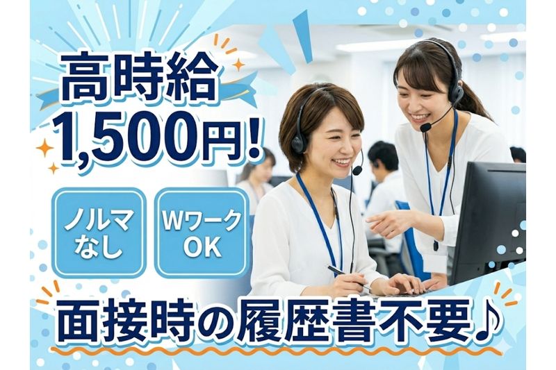 アピールポイント: \ 働きやすさも魅力のひとつ♪ / 職場にはドリンクサーバー完備◎ お水・お茶・コーヒーを 自由にご利用いただけます♪ お電話業務で喉を使うお仕事だからこそ、 いつでも気軽にリフレッシュできる環境です。 さらに、無料のカップラーメンもご用意! お昼代を抑えたい方や お弁当の準備が難しい日にも嬉しいポイント◎ 日によっては うれしい差し入れがあることもあります♪ \ 自分らしく働ける自由な職場 / 勤務中のスタイルは自由度高め◎ 私服勤務OKなので、 ラフで動きやすい服装で働けます♪ さらに、 髪型・髪色・ネイルも自由! お仕事終わりにそのまま予定を入れやすく、 オシャレを楽しみながら働ける環境です。 自分らしいスタイルのままで 無理なく続けられます――☆ \ このお仕事のおすすめポイント / ⭐ ノルマなしで安心スタート ⭐ 未経験でも時給1,500円~ ⭐ アポイント獲得でインセンティブ支給 ⭐ 1日4時間~OK/時短勤務相談可 ⭐ 小休憩中も給与支給あり ⭐ 面接時の履歴書不要で応募ラクラク