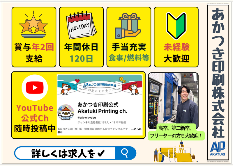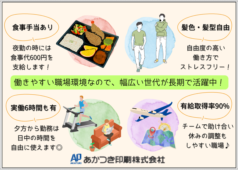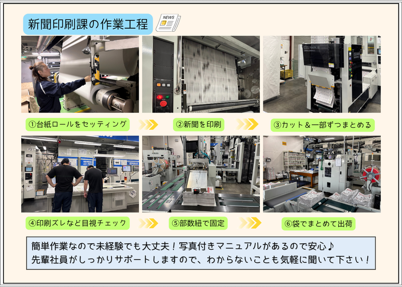 仕事内容 ⏰学歴・経験不問!⏰高卒・短大卒も大歓迎! \\機械オペレータースタッフ募集// ✅当社で働く魅力! ◆実働6~7時間の勤務日もあり、体への負担も少なめ♪ ◆シフト制!夕方からの勤務の日は日中の時間を自由に使えます◎ ◆食事手当あり!夜勤の時には食事代600円を支給します! ◆有給休暇は年間15日以上を積極消化! ◆チームで助け合うので休みの調整もしやすい♪プライベートの予定も立てやすい環境です! ✅仕事内容 新聞を印刷する工場で、印刷機の操作・メンテナンス、印刷準備などを行う機械オペレーター業務です。 印刷物のセット、機械の立ち上げ、稼働チェック、品質確認など、機械を扱う工程が中心。 チームで作業を行い、その日その日の印刷スケジュールに合わせて、協力しながら作業を進めていきます。 先輩に聞きながら働ける環境なので未経験の方も安心して働けますよ♪ ⏰1日のスケジュール例 17:00| 出社・着替え、ミーティング(印刷物の確認・作業内容の共有) 17:15〜| 印刷スタート(機械の点検・用紙やインクの準備なども含む) 19:30〜| 休憩(30分) 20:00〜| 印刷作業の続き 23:20| 片付け・翌日の準備 23:30| 退勤 お疲れ様でした! ✅新聞ってどんな役割? 新聞は、毎日の出来事や大切な情報をまとめて届ける役割を果たしています!政治や経済のニュースだけでなく、地域の話題や暮らしに役立つ情報まで知ることができます。 スマホやSNSでは情報が多すぎて、正しいことと間違ったことの区別がむずかしいですが、新聞は専門の記者が取材して事実を確かめたうえで伝えています!! だから、安心して情報を受け取れるのが大きな役割です。人々が正しい情報を共有できることで、社会全体の安心や信頼にもつながっています✨ ✅働く社員インタビュー 【入社7年目/Oさん/20代】 ▼入社のきっかけ 岩手出身で、前職はプラント関係のオペレーターとして働いていました。 以前は人間関係に悩むこともあり転職を決意しましたが、今の職場はチームワークが良く、 困ったときはすぐに声をかけ合える雰囲気があり、「ここに転職して良かった」と感じています。 ▼仕事のやりがいと大変なことを教えてください 印刷の「色合わせ」がこの仕事の一番のやりがいで、思い通りの色がきれいに出たときは達成感があります。 一方で、勤務時間が短い分、限られた時間内に作業を終わらせる必要があるため、段取りや集中力が求められる点は大変です。 その分メリハリをつけて働けるので、仕事後は自分の時間も大切にできています!夜勤後にジムへ行くこともあります! ▼求職者へメッセージ! 所長をはじめ、気さくで話しやすいメンバーばかりで雰囲気の良い職場です! 各種手当や福利厚生も充実しており、安心して長く働ける環境が整っています。 ぜひ私たちと一緒に働きましょう! 【入社11年目/Tさん/40代】 ▼入社のきっかけ 岩手出身で、所長とは高校時代のアルバイト仲間。 これまで自動車関連企業やスポーツクラブなどを経験し、独立も考えていたタイミングで声をかけてもらいました。 「せっかくなら挑戦してみよう」と思い、入社を決めました! ▼転職してよかったですか? 勤務時間が比較的短いため、自分の時間をしっかり確保できるようになりました。 夜勤の後には、仲間や社会人になった子どもと飲みに行くこともあり、家族との時間も大切にできています。 仕事とプライベートのバランスが良くなり、転職してよかったと感じています! ▼今後どうなりたいですか? 新聞業界が変化していく中で、会社としても新しい取り組みに挑戦していく必要があると感じています。 これまで培ってきた経験を活かしながら、新しい事業や分野にもチャレンジしていきたいです! 変化を前向きに捉え、会社と一緒に成長していける存在になりたいと思っています。 ▼求職者へメッセージ! これまで経験のない仕事かもしれませんが、未経験の方も大歓迎です! しっかりサポートしますので、安心して飛び込んできてください。 コミュニケーションを大切にできる方と、一緒に楽しい職場をつくっていけたら嬉しいです。