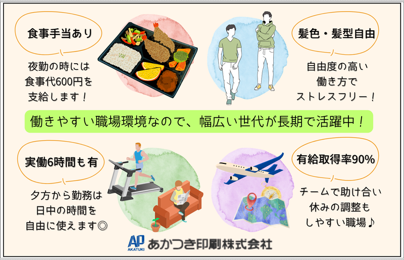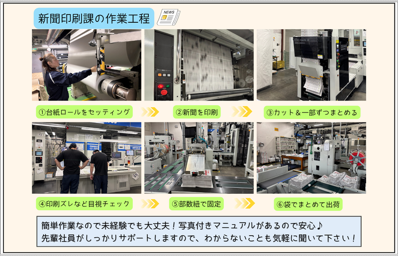 仕事内容 \\機械オペレータースタッフ募集// ⏰学歴・経験不問!⏰高卒・短大卒も大歓迎! - ✅当社で働く魅力! ◇実働6~7時間の勤務日もあり、体への負担も少なめ♪ ◇シフト制!夕方からの勤務の日は日中の時間を自由に使えます◎ ◇食事手当あり!夜勤の時には食事代600円を支給します! ◇有給休暇は年間15日以上を積極消化! ◇チームで助け合うので休みの調整もしやすい♪プライベートの予定も立てやすい環境です! - ✅仕事内容 新聞を印刷する工場で、印刷機の操作・メンテナンス、印刷準備などを行う機械オペレーター業務です。 印刷物のセット、機械の立ち上げ、稼働チェック、品質確認など、機械を扱う工程が中心。 チームで作業を行い、その日その日の印刷スケジュールに合わせて、協力しながら作業を進めていきます。 先輩に聞きながら働ける環境なので未経験の方も安心して働けますよ♪ ⏰1日のスケジュール例 17:00| 出社・着替え、ミーティング(印刷物の確認・作業内容の共有) 17:15〜| 印刷スタート(機械の点検・用紙やインクの準備なども含む) 19:30〜| 休憩(30分) 20:00〜| 印刷作業の続き 23:20| 片付け・翌日の準備 23:30| 退勤 お疲れ様でした! - ✅新聞ってどんな役割? 新聞は、毎日の出来事や大切な情報をまとめて届ける役割を果たしています!政治や経済のニュースだけでなく、地域の話題や暮らしに役立つ情報まで知ることができます。 スマホやSNSでは情報が多すぎて、正しいことと間違ったことの区別がむずかしいですが、新聞は専門の記者が取材して事実を確かめたうえで伝えています!! だから、安心して情報を受け取れるのが大きな役割です。人々が正しい情報を共有できることで、社会全体の安心や信頼にもつながっています✨ - ✅働く社員インタビュー 【入社7年目/Oさん/20代】 ▼入社のきっかけ 岩手出身で、前職はプラント関係のオペレーターとして働いていました。 以前は人間関係に悩むこともあり転職を決意しましたが、今の職場はチームワークが良く、 困ったときはすぐに声をかけ合える雰囲気があり、「ここに転職して良かった」と感じています。 ▼仕事のやりがいと大変なことを教えてください 印刷の「色合わせ」がこの仕事の一番のやりがいで、思い通りの色がきれいに出たときは達成感があります。 一方で、勤務時間が短い分、限られた時間内に作業を終わらせる必要があるため、段取りや集中力が求められる点は大変です。 その分メリハリをつけて働けるので、仕事後は自分の時間も大切にできています!夜勤後にジムへ行くこともあります! ▼求職者へメッセージ! 所長をはじめ、気さくで話しやすいメンバーばかりで雰囲気の良い職場です! 各種手当や福利厚生も充実しており、安心して長く働ける環境が整っています。 ぜひ私たちと一緒に働きましょう! 【入社11年目/Tさん/40代】 ▼入社のきっかけ 岩手出身で、所長とは高校時代のアルバイト仲間。 これまで自動車関連企業やスポーツクラブなどを経験し、独立も考えていたタイミングで声をかけてもらいました。 「せっかくなら挑戦してみよう」と思い、入社を決めました! ▼転職してよかったですか? 勤務時間が比較的短いため、自分の時間をしっかり確保できるようになりました。 夜勤の後には、仲間や社会人になった子どもと飲みに行くこともあり、家族との時間も大切にできています。 仕事とプライベートのバランスが良くなり、転職してよかったと感じています! ▼今後どうなりたいですか? 新聞業界が変化していく中で、会社としても新しい取り組みに挑戦していく必要があると感じています。 これまで培ってきた経験を活かしながら、新しい事業や分野にもチャレンジしていきたいです! 変化を前向きに捉え、会社と一緒に成長していける存在になりたいと思っています。 ▼求職者へメッセージ! これまで経験のない仕事かもしれませんが、未経験の方も大歓迎です! しっかりサポートしますので、安心して飛び込んできてください。 コミュニケーションを大切にできる方と、一緒に楽しい職場をつくっていけたら嬉しいです。