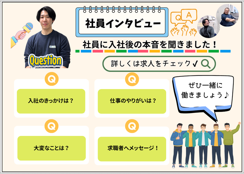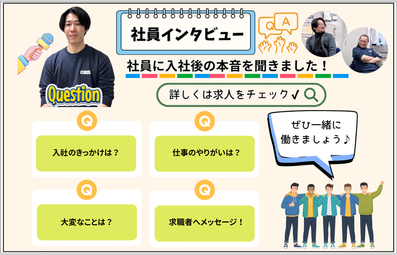 選考プロセス 私たちのチームは、少人数で協力し合いながら業務を進めています! 今後、さらなる生産性向上を目指し、共に成長できる新しい仲間を迎え入れたいと考えています。ぜひ一緒に働きませんか✨? 【選考フロー】 応募 → 書類選考 → 面接(簡単な筆記試験あり) → 内定 ※書類選考通過後、1時間ほど会社見学と仕事内容の説明時間を設けています。 職場の雰囲気を実際に見てから、面接に進むかご判断いただけます! ※人柄重視の採用です!
