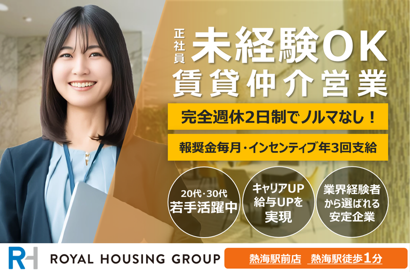 仕事内容 ❖ポイントをサクっと紹介! ✅ 未経験から不動産知識が身に付く! ✅ 100%反響営業・新規飛び込み営業なし! ✅ 完全週休2日(ローテーション制) ✅ 育児休暇もとりやすい環境です。 ✅ インセンティブ年3回支給 ✅ 報酬金もあり/毎月(現金) ✅ 転勤なし。現在住んでいるところ無理なく通えます。 定員になり次第、募集締め切りいたします。 ぜひ、この機会をお見逃しなく、お気軽にご応募くださいね。 ========================= <仕事の内容> お客様に合うお部屋をご紹介する不動産賃貸営業をお任せします。 ◆反響やお問い合わせへの各種対応(メール・電話での折衝) ◆物件登録 ◆お部屋探しの物件ご提案 ◆内見同行 ◆契約書作成など各種事務・データ入力 ◆物件仕入れ・写真撮影 など ========================= <未経験者が活躍中!> 当社入社の9割以上が未経験から入社しております。 元車のディーラー営業、アパレル・スマホ販売、ホテル出身者など、 ゼロからスタートして活躍している先輩社員も多数。 入社後はまず不動産知識や接客マナーをはじめ、 業務の基礎を学んでいただきます。 その後は先輩社員によるロープレや 商談への同席を通じて徐々にステップアップ。 約3ヶ月にわたる研修を経て、独り立ちします。 <100%!完全反響営業> メールや電話などでお問い合わせをいただいお客様や 直接ご来店いただいたお客様にのみ、 物件提案を行っていただく100%完全反響営業なので 働きやすさは抜群! 口コミなどを見てご来店いただくお客様も多く、 当社が設立以来大事にし続けてきた人と人との信頼関係が現在の業績好調と実績に繋がっています◎ <扱う物件は?> <先輩がやさしくフォロー> 各店舗には5名~約50名程度のスタッフが在籍。 風通しも良く、面倒見の良い先輩ばかりなので 困ったときは気軽に相談できます。 約3ケ月の丁寧な研修を用意しています。 賃貸はオーナーズエージェント社のツールなど 外部研修まで幅広く用意しています。 売買は社内研修、契約書の本社チェックまで幅広くあります 単身向けからファミリー向けマンションまで幅広く取り扱います <給与以上にもらえるお金が多い!> 自身の売上から毎月報奨金をお渡ししています! 年3回支給される業績給などのボーナスなど 給与の他に支給されるボーナスを多く用意しています! スタッフによっては毎月の給与は貯金して、 報奨金や業績給などのボーナスで生活している方もいます。 <反響営業が中心!飛び込みは一切なし> ご来店、チラシ、インターネットからの お問い合せ対応が基本なので 飛び込み営業は一切なし。 業界未経験の方もご安心ください。 <入社後も様々なキャリアの選択肢がある> 当社は賃貸、売買、リフォーム、リゾート仲介、有料老人ホームの ご紹介と様々な部門がございます。 ぜひキャリアイメージをお聞かせください。 <ロイヤルグループについて> 1975年創業、不動産仲介ひと筋に事業を 展開。多くの実績を重ね、まさまざまな 社会貢献により企業としての責任を果たしてきました。 当社のもっとも大きな特徴は、 一人暮らしの住宅からファミリー向け住宅、 リゾート仲介に高齢者の住まいまで、 人の一生のあらゆるステージに必要な 「住まい」すべてに関わるサービスを ワンストップで行なっているということです。 一人のお客様と長くお付き合いすることも あり、そこにやりがいも生まれます。