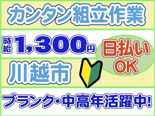 仕事内容 川越市にある優良企業で残業少なめのお仕事 流れ作業やライン作業ナシの組立作業です 【組立スタッフのポイント】 〇単純作業、もくもく作業 〇未経験OK 〇高時給1300円 〇正社員雇用あり 〇日勤のみ 〇土日祝休み 〇20代30代40代50代の男性活躍中 〇制服貸与 〇日払いOK(規定内) 〇履歴書不要 〇「マイリク定着支援」導入企業! 【組立スタッフの仕事内容】 リネンサプライに使われるフォルダーの組立作業 小規模で流れ作業やライン作業ではありませんので、 自分のペースで作業出来ます。 細かい作業ではないので製造未経験の方でも 安心して始められる環境です 人気の土日祝休み。 残業もまれにある程度です。 まずは職場見学もOK(30分~1時間程度) 見学してからお決めいただけます 【勤務について】 ・日勤のみ(8:20~17:20) ・土日祝休みの完全週休2日制 急な発熱・体調不良・冠婚葬祭など 突発的なお休みに柔軟に対応しております。 【こんな経験活かせます】 特別な経験・資格は 必要ありませんのでご安心ください。 下記経験者は前職活かせます。 〇長期アルバイト・パート 〇組立パート・アルバイト 〇軽作業パート・アルバイト 〇主婦(夫)パート・中高年パート 前職不問で採用しております。 ブランクのある方もOK 経験の浅い方もOK。 〇ご不明な点はお気軽にお問い合わせください〇 お電話でのご応募、ご質問も受付中 株式会社ロフティー 川越支店 TEL0800-222-6888(フリーダイヤル) お仕事情報など採用ページはこちらから https://entori.jp/lofty-kawagoe ハローワークでお仕事探しをされてる方も 是非1度お問合せ下さい コーディネーター・定着支援のWサポート体制導入 「マイリク定着支援」導入企業! アンケートで職場の様子を確認し、 コーディネーター・定着支援担当が連携してサポート。 はじめての派遣でも安心して働けるよう迅速かつ 丁寧にサポート対応いたします。