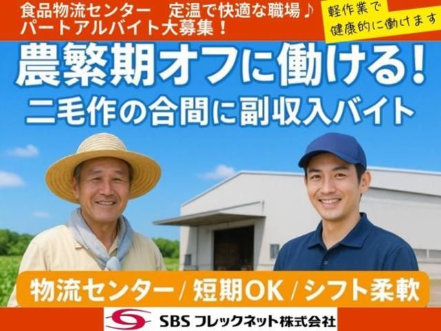 仕事情報 ● 仕事内容 夏は涼しく、冬は外気よりも暖かい快適な職場環境です。スーパーマーケットやコンビニ向けの食品の入出荷や仕分けのお仕事です。牛乳やヨーグルトなどの乳製品やお惣菜やお弁当など、普段の生活に欠かせない身近な商品を取り扱っていただきます。仕分け作業がメインなので、ご自身のペースで作業したい方にお勧めです! 未経験歓迎シフト柔軟対応 商品のバーコードを読み込んで、仕分けするお仕事のため、間違いにくく初めての方も覚えやすい仕事です。モクモク・コツコツとお仕事したい方におすすめです。未経験者でも安心してお仕事を始められるように、先輩スタッフがやさしくサポートします!勤務日数や勤務時間をご自身で選択して勤務いただけます。 職場の雰囲気◎前払いOK 職場内では役職者も含めて全員を「さん」付けで呼びあい、みんなが遠慮なく意見を言い合える環境づくりをしています。また、給与の前払いOK!スマホで簡単、支給日前に給与を受け取れます!振込手数料は全額会社負担で、上長承認や理由記載不要。申請後1時間ほどで入金完了いたします。 自分に合ったシフト選び ライフスタイルに合わせて働く時間帯を選ぶことができます。夕食の支度までに帰宅したい方、午前中はゆっくり過ごしたい方などご自身の生活に合わせた働き方ができます。出勤日数なども柔軟に対応いたします。扶養内で働きたい方なども、お気軽にご相談ください。農閑期の合間に無理なく働ける環境です。 SBSフレックネットとは SBSフレックネットは長年「食の物流」に特化してきた会社です。社内では役職者も含めて全員「さん」付で呼び合い、誰もが意見できる環境です。実際、新入社員の提案が採用されたこともあります。進化をやめない会社だから、業界トップクラスで居続ける。SBSフレックネットは、未来の物流サービスを築きます。