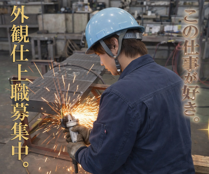 仕事内容: コツコツ作業が好きな方にピッタリ。 工場内での仕上げ作業のお仕事です(屋外作業はありません)。 未経験の方でも、工具の使い方から丁寧に指導しますので安心してスタートできます。 ◆主な仕事内容 ・溶接後の仕上げ作業(スパッタ取り) ・サンダーを使った研磨作業 ・製品の表面を整える作業 ※最初は簡単な作業からスタートします ※すべて工場内作業のため、天候に左右されません ※希望により社内部署異動も可能です