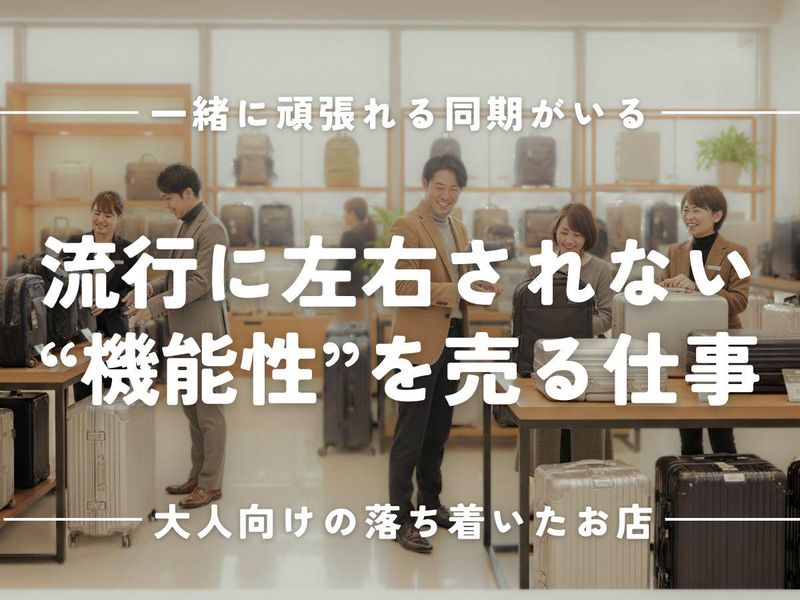 求めている人材 ◎未経験OK ◎フルタイム歓迎 ◎30~40代活躍中 ◎同期ができるオープニング募集 ◎主婦主夫活躍中 ○ワークライフバランス○ シフトは希望制なので お休みや早番、遅番の希望OKです。 閉館時間が早いので残業もほぼなし! ○30~40代中心の職場○ 若い子ばかりの職場ではありません。 元気な接客よりも、 30代・40代の円熟した対応が喜ばれます。 ○生活の道具としての使い道○ シンプルで洗練されたブランドなので 「整理整頓」「旅」「上質さ」という点で 女性からも支持されています。 出張の多い女性のお客様も増えており、 女性ならではの視点でパッキングのコツや軽さを伝えてください。 ○トレンドを追うのに疲れた大人達へ○ 毎シーズン在庫が総入れ替えになる忙しさはありません。 コーディネートの提案よりも、 機能性や頑丈さという『事実』を伝えます。 流行に左右されず一度覚えた知識が長く使えます。 長く落ち着いて働ける安心感がほしい方におすすめ!