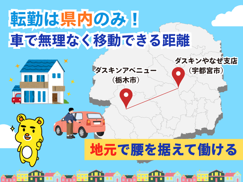 求めている人材 ★未経験歓迎★異業種から転職した社員が大多数です!! 【必須】 業務で社用車の運転が可能な方 【歓迎】 ・販売/接客経験(業界不問:家電量販店、携帯、アパレル、ホームセンター等) ・売場リーダー/副店長/後輩指導など、チームで動いた経験 【求める人物】 ・お客様対応が好きで、丁寧に関係づくりができる方 ・人と話すことに抵抗がない方 ・決められた仕事をコツコツ続けられる方 ・将来的に後輩指導や管理にも挑戦したい方 ・残業を減らし、生活を整えながらキャリアも伸ばしたい方 【こういう方に向いています】 ・閉店後作業や欠員対応で、残業が当たり前の働き方を変えたい方 ・接客・販売で培ったヒアリング力/提案力を、既存のお客様相手に活かしたい方 ・地元(栃木市・宇都宮市)で腰を据えて、生活リズムを整えながら働きたい方