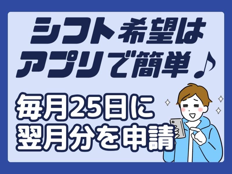 勤務時間詳細 <勤務時間>平日 17:00~21:00(実働4h) ※シフトは毎月25日に翌月分の希望をアプリで送信! 送信後の変更も可能で、自分の予定や都合なども考慮した上で働ける♪