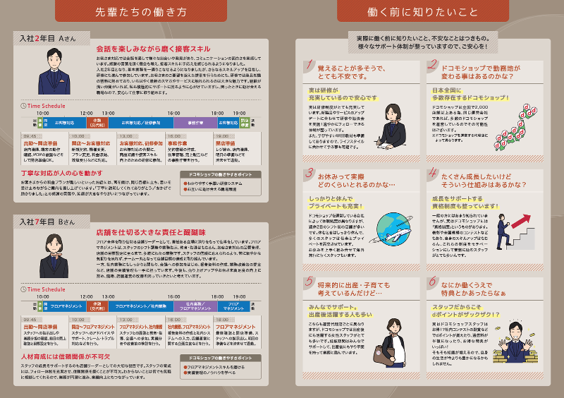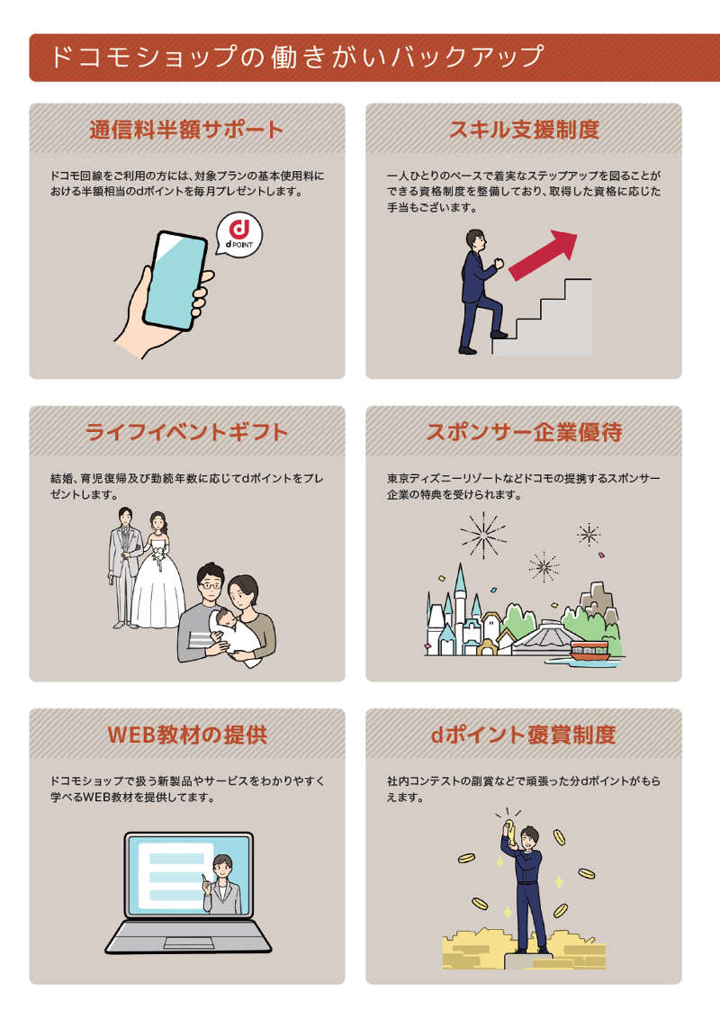 アピールポイント: \職場の雰囲気/ 少人数でアットホーム。 地元のお客様が中心。 スタッフ同士の距離が近く、相談しやすい職場です。 売る人より、支える人を評価したい。 そんな考え方の職場です。 \未経験者さんもOK!/ 【未経験でも大丈夫な理由】 * スタッフの約9割が未経験スタート * マニュアル+段階的な研修あり * 必ず先輩が横についてフォロー * 分からないことはすぐ聞ける環境 「スマホは正直苦手でした」 というスタッフも、今では頼られる存在です。 \期間ごとに連休取得もできる!/ ・月/8~10日の休日 ・休日2日分は土日も含めて希望休の取得が可能 ・連休も取得できる \ドコモからのスタッフ還元制度/ (通信料半額支援、dポイント報奨制度、動画や音楽サービス使い放題など) ・お楽しみ企画あり 休みをしっかりと確保することで社員みんなが 無理なく快適に働ける職場環境を整えています。 産休・育休制度を利用している社員もいますので、 子育て中のパパさん・ママさんも安心して働けますよ!