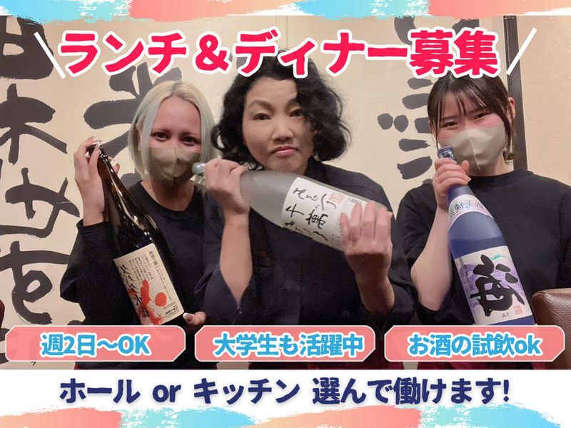 求めている人材 学生アルバイト活躍中&歓迎! 主夫・主婦パートさん、フリーターさん歓迎♪ 来年春から新大学生になる高校3年生さんなども大歓迎です。 《1つでも当てはまればご検討ください!》 ■授業やサークル、Wワークとの両立も可能な シフト融通があるバイト先を探している ■社会人さんのセカンドワークOK◎ ■土日だけ働くのもOK◎ ■飲食店アルバイトが初めての方 ■アルバイト・パート未経験の方 ■接客が好きな方 ■和食料理・お酒が好きな方 ■ホール業務経験者 などなど大歓迎です! 是非ご応募お待ちしてます!