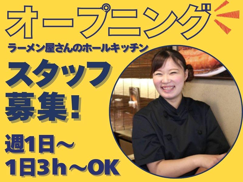 仕事内容  ̄ ̄ ̄ ̄ ̄ ̄ ̄ ̄ ̄ ̄ ̄ ̄ ̄ ̄ ̄ ̄ ̄ ̄ ̄ ✅週1日~、1日3時間~勤務OK! ✅土日祝+50円(1hにつき)の手当あり✊ ✅髪色自由!ピアス・ネイルもOK◎ ✅美味しいまかないが無料♪ ✅未経験歓迎!みんな一緒に再スタート! ∽∽∽∽∽∽∽∽∽∽∽∽∽∽∽∽∽∽∽∽ ┏━━━━━┓ ┃お仕事内容┃ ┗━━V━━┛ ⏩ホール業務 ▶お客様を席までご案内 ▶オーダーの確認作業 └食券制なので確認だけでOK! ▶料理の提供 ▶店内清掃 など ⏩キッチン業務 ▶ドリンク作成 ▶ラーメンなどの調理・盛り付け ▶仕込み作業 ▶食洗器を使った洗浄業務 など ∽∽∽∽∽∽∽∽∽∽∽∽∽∽∽∽∽∽∽∽ ⭐サポート体制抜群❗ リニューアルオープンだから 頼れる先輩のもとでスタートできて安心✊ ⭐あなたらしく働ける❗ 髪色は自由!金髪でも派手髪でもokです! ピアス・ネイルも派手すぎなければ◎! 無理に自分を変えずに、あなたらしさを 大切にしながら働けます♪ 飲食だけどオシャレも楽しみたい! という方にピッタリ! ⭐無料の絶品まかないあり❗ ラーメンやサイドメニューなど、 種類も豊富で飽きません! 「今日は何かな?」とワクワクしながら 働ける嬉しい特典です!
