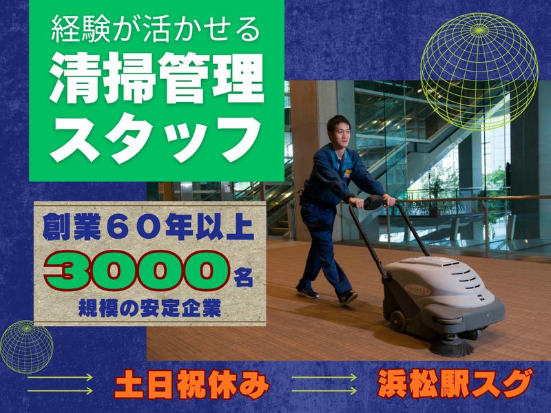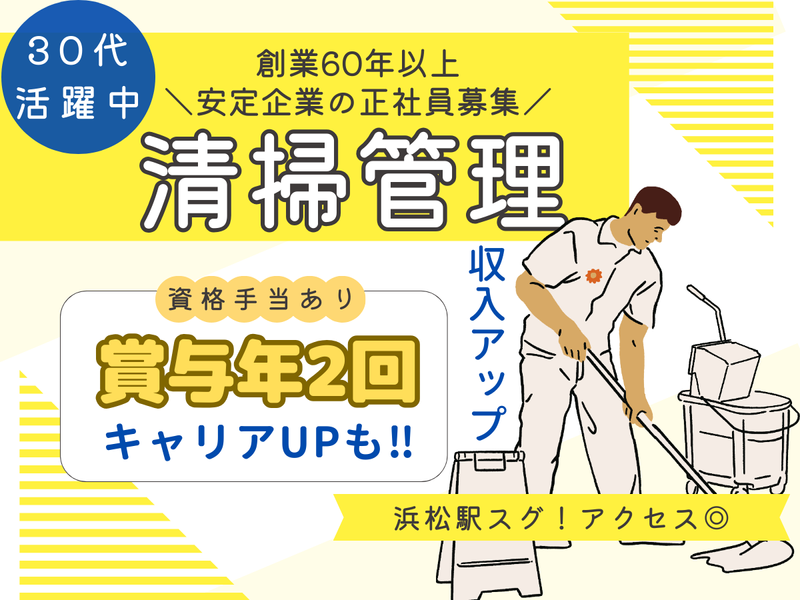 仕事内容 ✅20~30代の中途入社スタッフ活躍中 ✅従業員3000名規模の安定企業 「清掃の経験を活かして、 次は管理のお仕事に挑戦したい!」 そんなあなたにピッタリ! 今回は、清掃業務の経験を活かして 管理業務へチャレンジしたい方を募集します。 ・‥…━━━・‥…━━━・‥…━━━ <✨創業60年以上の信頼と安定> 従業員数3000人以上を誇る当社は、 ストック型ビジネスで 安定した収益を実現しています。 社会情勢に影響されず、 コロナ禍でも業績好調でした。 「清掃経験を活かして、次は管理へ」 そんなキャリアアップを目指すあなたに最適な環境です! ・‥…━━━・‥…━━━・‥…━━━ <✨ワークライフバランス良好◎> 年間休日108日、 残業月10~20時間程度で プライベートも充実! 無理なく働ける環境で、 仕事と生活のバランスを大切にできます。 <✨キャリアアップ×給与UPも可能!> 清掃経験をベースに、ゆくゆくは副主任、主任へと キャリアアップが目指せます! 役職が上がることで、 給与UPや業務の幅も広がります! ▼さらに… 資格取得支援制度があるので ビルクリーニング技能士などの 資格取得も可能です◎ ・‥…━━━・‥…━━━・‥…━━━ <✨仕事内容は…> 当社が管理する施設内の清掃及び スタッフの管理業務をお願いします。 ✅清掃業務 担当現場(商業施設)での 清掃やスタッフの管理。 ※直行直帰も出来ます。 ✅事務作業 新たに清掃する施設についての 打ち合わせや作業スケジュール管理など。 ※浜松営業所での勤務となります。 ・パート社員のシフト作成 ・パート社員への清掃指導 ・協力会社の作業日程調整 ・業務報告書作成 ・作業立会い(夜間立会いあり) ・清掃代務(施設内の通路や床の掃除、トイレ清掃や消耗品の補充、ゴミの回収など) など幅広い業務をお願いします。 清掃作業自体はシンプルなものばかり。 まずは現場経験を活かしながら、 管理者としてのスキルを一歩ずつ習得していけます。 ▼入社後の流れ  ̄ ̄ ̄ ̄ ̄ ̄ ̄ ̄ ̄ ̄ ̄ ̄ ̄ ̄ ̄ ̄ ̄ ̄ ・入社後は、パートさんや先輩社員と 一緒に清掃業務からスタート! ・パートさんたちとのコミュニケーションを通じて 現場の流れや管理のコツを学びます。 ・その後、スタッフ管理や事務的な業務を 少しずつ任されていきます。 わからないことは何でも聞いてくださいね◎ ・‥…━━━・‥…━━━・‥…━━━ <✨“一生モノ”のスキルが身に付く> 業務に必要な資格はもちろん スキルアップのための資格取得は 会社が支援! 持っている資格に応じて手当がつくので 給与アップも望めます。 例えば… ・建築物清掃管理評価資格者 ・清掃作業監督者 ・建物環境衛生管理技術者 ・ビルクリーニング技能士 ・ビル管理士 など