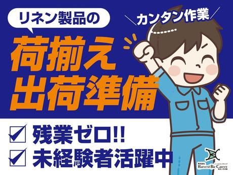 仕事内容 \リネン製品のピッキング・出荷準備のカンタン作業/ ホテルにお届けするシーツ・タオルなどのリネン製品をピッキング、出荷準備をする簡単なお仕事です。 シンプルな4つの作業です! (1)指示書確認 (2)指定されたシーツ・タオルなどのリネン製品を取る (3)専用の台車に入れる (4)倉庫の所定の場所に運ぶ 1人での黙々作業です。 【扱うもの】 シーツ・タオルなどのリネン製品を扱います。 【使用する機械・ツール・ソフト】 台車を使用します★ (最大5kg前後の重さです。) 【残業ナシ♪年間休日120日でプライベートも充実】 基本的に残業はなく、年間休日は120日(シフト制)♪ お仕事とお休みのメリハリをつけて、無理なく働けます◎ 【シフト相談OK!自分らしい働き方ができる♪】 希望シフトの相談もOK! 「しっかり働きたい」「プライベートも大切にしたい」など、 ライフスタイルに合わせた働き方が可能です★ 【未経験でも安心の職場環境】 ・未経験からのスタート大歓迎! ・20代~50代まで、男女ともに幅広く活躍中♪ ・屋内での立ち仕事なので、天候に左右されません ・空調完備で一年中快適に働けます◎ 「初めての職場で不安…」という方もご安心ください♪ アットホームな雰囲気で、困ったときはすぐに相談できる環境です。 単純な軽作業なので、モクモク作業が好きな方にもピッタリです◎