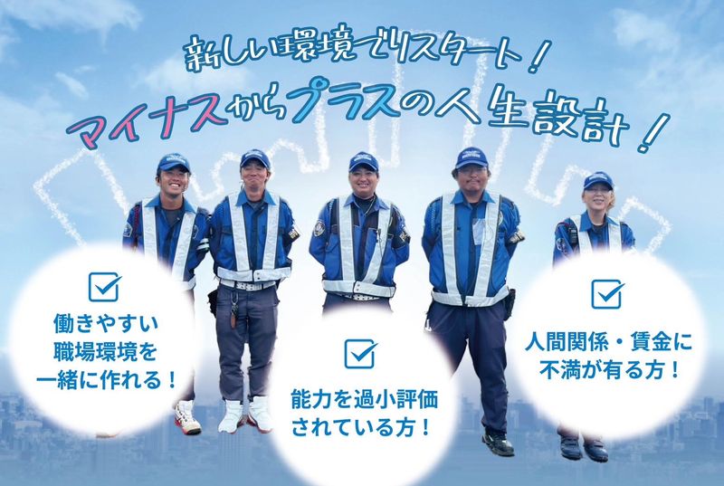 求めている人材 <必須項目> ※年齢: 18歳以上(警備業法) ※運転免許: 原付免許以上(基本、直行直帰の為) ※移動手段: 自分だけの車かバイクが必要(家族共有は不可) ・扶養内(扶養外でも大丈夫!) ・副業OK(夜間のみ・土日のみの勤務はしていません。) ・学歴不問 ・スタッフの「7割」が家庭持ち! ・家庭での時間を大事にできる◎ ・遠方から勤務される方もいます★ ・働きやすさと安心感が自慢♪ 家族と過ごす時間をしっかり確保して日 々の活力にする方や、勤続20年以上の方 も在籍中! みんなが長く安定して働けるヒミツは、 「スタッフを大事にしたい」という 社長の強い想いがあるから‼ 【現場でのフォロー体制も万全】 暑い夏は空調服!寒い冬は防寒コート支給で安心! 年齢の条件と理由:あり(18歳以上(警備業法))