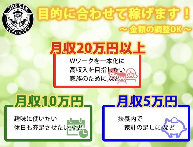 仕事内容 <アピールポイント> ―――――――――――――――――――― ◆日払・週払いOK ◆主婦・元気なシニア・未経験者活躍!! ◆扶養内勤務・週2日~勤務OK!! ☆交通誘導警備・雑踏警備・列車見張り等を メインに現場の「安全」を確保!未経験か らでも研修があるので大丈夫です!現場で も2名体制以上なので安心です! <仕事内容> ―――――――――――――――――――― 建設・工事現場、イベント会場等で、関わる すべての人達に安心と安全を提供します。 【交通誘導警備業務】 国道・県道・市道で、片側通行・歩行者誘 導・通行止め・車線変更や、工事車輌の誘 導等を行います。 【雑踏警備業務】 各種イベント会場において会場内外の安全 を確保します。 【駐車場警備】 ス-パ-・銀行・神社などの、駐車場の出 入口で、お客様の車輌と歩行者・一般車輌 との接触事故防止や、周辺道路の渋滞緩和 に努めます。 <担当者からのメッセージ> ―――――――――――――――――――― 貴方は、「今どのような気持ち」で、お仕事 を探されていますか? 「孫に成人の祝いを贈りたい」 「大切な人のためにプレゼントを贈りたい」 「クリスマスや正月、進学や就職などのイベントに向けて貯金しておきたい」 「月単位ではなく、週払いで定期的に収入を得たい」 「平日の空いた日に、週2日程度の勤務など、自分のペースで働きたい」 「とにかく稼ぎたい」 上記のようにお仕事を探している「環境や理 由」は本当に様々だと思います。 私たち綜合創研警備保障は貴方が描く「希望 の働き方や働く目的」を、叶えられるようサ ポートします。 まずはお気軽にお問い合わせください! <綜合創研警備保障の取り組み> ―――――――――――――――――――― 【SDGsの取り組み①】 主婦の方の扶養内勤務や、シニアの方達の再 雇用に力を入れ、社員が長く働ける職場作り を行なっています。 【SDGsの取り組み②】 社員全員は給与と別に評価制の手当支給があ りますので、性別に関係なく、いつ又何歳で 入社しても、毎月安心して公平な評価(手当 )を受けることが出来ます。 【未来に対する取り組み】 2022年より、AIを活用した交通誘導業務 にも力を入れてます。 上記の取り組みを通して、私たち綜合創研警 備保障はこれまで以上に多くの方に「安心」 をお届けできるよう邁進していきます! 貴方の挑戦(ご応募)お待ちしております!