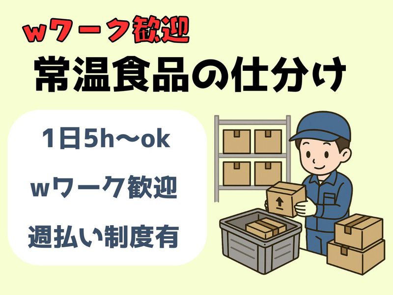 仕事内容 \シンプル作業で未経験でも安心♪/ 常温倉庫内での「食品の検品・仕分け・ピッキング」などの軽作業をお任せします! 具体的には… ・食品にキズや汚れがないかチェック(検品) ・お店ごとに商品を振り分け(仕分け) ・指示書を見ながら商品を集める(ピッキング) どれも未経験から始めたスタッフが多数活躍中のカンタン作業ばかり!重たい物は少なく、男女ともに働きやすい環境です◎ 作業中はモクモク集中できるので、「黙々と体を動かしたい方」や「難しい作業は苦手…」という方にもおすすめ♪ 勤務時間も【早朝・日中・夕方~夜】と選べるので、Wワークや家庭の都合に合わせて働けます。 週2日~OKだから、無理なく長く続けられますよ♪ #未経験歓迎 #カンタン軽作業 #週2日~OK #車通勤OK #シフト自由