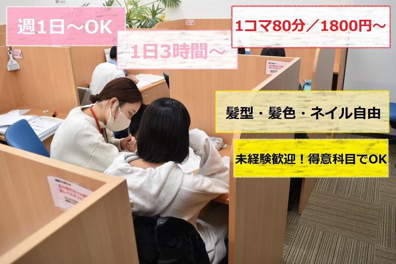仕事内容 *1日3時間からスキマ時間に働ける! *副業・Wワーク・扶養内・短時間OK! *1コマ80分で1800円!効率よく稼げる! *来春から新大学1年生(現高校3年生)も歓迎!友達同士の応募OK! ★現高3生で公募試験等で大学が内定した学生さんも大歓迎! できる範囲で仕事をお任せしますので、ぜひご応募下さい! 【仕事内容】 小学生、中学生、既卒を含む高校生への学習指導!担当生徒の通塾目標に向けて定期テストや受験に向けて指導を行います。教科は英語・数学中心に5教科から選択可。得意な教科だけでもOKですので、まずはあなたの希望指導教科を教えてください! 【人生経験が活きる!】 あなたが中学・高校生の時に試行錯誤して培ってきた、勉強の経験やノウハウを待っている生徒がいます!成功体験はもちろん、苦労話や失敗談も多ければ多いほど担当する生徒のためになりますよ。 【生徒は担当制】 当教室は、先生1名に対して生徒2名の1対2形式の個別指導スタイル。生徒は担当制なので、担当する生徒と半年~1年にわたって継続して指導をすることができるので、生徒の成長を見守りながら、中長期の目標達成に向けて指導することができます。 【これ以上にないやりがい】 自分が担当した当時は、まだまだ未熟だった生徒が、しっかり成長して受験合格の報告をしてくれた時などは、担当指導者としてこれ以上ない熱い思いがこみ上げます! 【未経験から始められる!】 授業は原則80分制。あらかじめ決められた時間帯に授業を行います。一回出勤で最低2コマの授業実施を推奨しています。また、教育カリキュラムが整っているので、未経験でもしっかり教室全体でバックアップするので安心して下さい。 【金髪もOKの職場!】 服装は自由(男性はオフィスカジュアル)、頭髪の色も自由です。実際に季節毎にスタッフの髪色が緑色やオレンジ色など七変化!外見よりも働きぶりを重視しますので、オシャレも楽しみながら塾講師としても働けます。 【掛け持ちバイトOK】 実際、飲食店バイトとの掛け持ち学生も多く在籍しています!週1コマだけでもOK!都合に合わせて働けるから長く続けられると思います!あなたの経験や知識を活かして働いてみませんか?