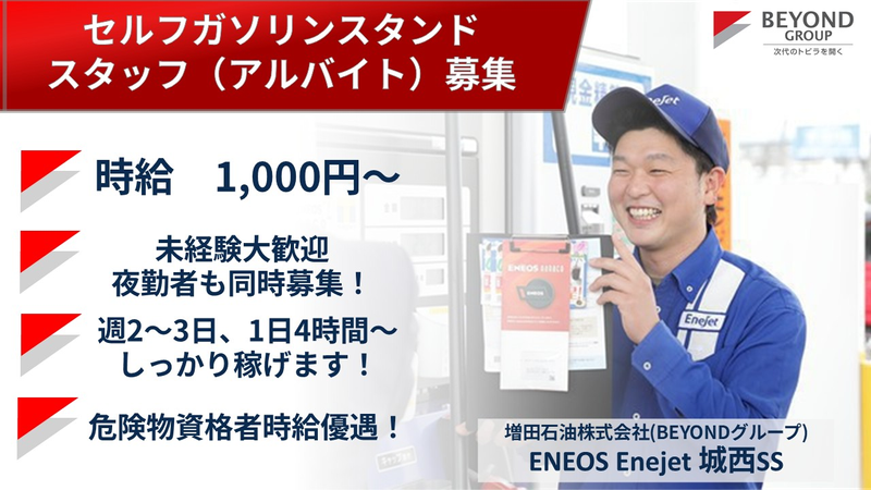 ■求める人物像・資格 【応募資格】 ・学歴不問、経験不問、資格不問 ・危険物取扱者資格をお持ちの方は優遇します! 【こんな方は歓迎します】 ・未経験歓迎、初心者OK ・扶養内で働きたい主婦(夫)さん ・Wワークやフルタイムのお仕事をお探しのフリーターさん ・学業と両立して働きたい学生さん ・体を動かしながら働きたい方 ・車が好きな方