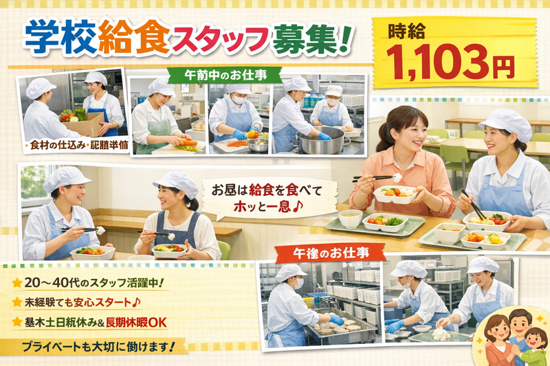 仕事内容 ~・~・お仕事内容・~・~ ★市内小学校の学校給食調理のお手伝いをおまかせします。 ★現場では調理師さんや社員さんがメインで給食を調理しますので、そのサポートとして食材の下準備や洗浄業務をおこなっていただきます。 ①出社~午前中 ・業者さんから届いた食材の荷受け ・食材の下処理(野菜の皮むきやカット) ・調理中に使用した調理器具の洗浄 ・給食時間に向けて配膳準備 etc ②休憩時間 ・その日の給食を休憩室で食べるのでお弁当の準備はいりません! ・昼食後はホッと一息休憩タイム ③給食時間終了後~終業時間 ・戻ってきた食器の洗浄・乾燥 ・調理器具の洗浄 ・翌日の準備で食器をクラスごとの台車にセット ・清掃 etc - 20~40代のスタッフが多数活躍! 短めの時間でお仕事をお探しの方におススメ! 未経験からスタートしたスタッフさんも複数在籍! 家庭料理で行う作業ができれば、あとは先輩からのサポートを受けながらお仕事を覚えることができます! (大人数の調理経験のある方優遇!) 基本土日祝お休み・長期休暇取得可能! 残業少なめで、プライベートも大切にしながら働けます。 - お仕事相談会のお知らせ(予約不要・履歴書不要) 上越市近郊で仕事をお探しの方、必見です! 「今の職場を変えたい」「そろそろ働きたいけれど不安」そんなお悩みはありませんか? そんな方はぜひお仕事相談会に寄ってみてください◎ 【この相談会のポイント】 ✅ 予約不要!お買い物ついでに立ち寄れます ✅ 履歴書不要!手ぶらでOK ✅ 服装自由!私服でお気軽にお越しください ✅ お友達との来場、お話だけでも大歓迎です 【開催スケジュール】 ①3/28(土)11:00~14:30 ②4/5(日)13:00~15:30 ③4/11(土)11:00~14:30 ④4/18(土)13:00~15:30 【会場】上越市民プラザ1F 多目的学習室 あらゆる世代の方を大歓迎しております。 まずは会場で、あなたにぴったりのお仕事を見つけませんか?