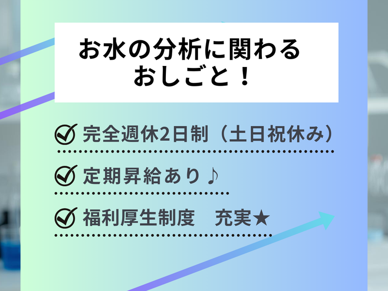 仕事内容 ✨お水の成分を調べる分析スタッフ✨ 完全週休2日制(土日祝休み)で、 家庭や自分の時間もしっかり確保♪ 上場グループ企業なので、安定して長く働ける環境です。 【お仕事内容】 お水の成分を調べる部門での お仕事です。 ◆ガラス器具(ビーカーやフラスコなど)や 試薬(検査用の薬品)を使った お水の分析作業。 ■専門知識や経験は一切不要◎ 未経験から始めた先輩が多く、 最初は教育担当が横について丁寧にサポートします。 「久しぶりのお仕事復帰」「未経験から挑戦!」 そんな方にぴったりです♪