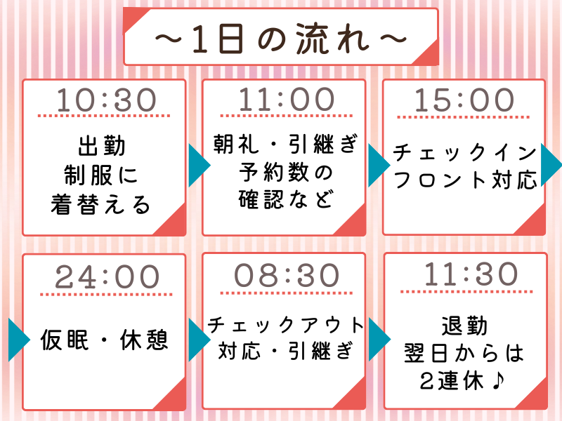 勤務時間詳細 総労働時間:1ヶ月あたり150時間15分 〜 171時間 <勤務時間> 10:30~翌11:30(実働時間20時間45分) (休憩4時間15分あり ▶仮眠2時間、1時間×2回=2時間、朝15分×1回) ~1日の流れの一例~ 10:30 出勤・制服に着替える 11:00 朝礼・引継ぎ・予約数の確認など 15:00 チェックイン対応・フロント対応 24:00 仮眠・休憩 04:00 ロビー設置のアメニティ補充 06:00 朝食会場のお手伝いなど 08:00 チェックアウト対応・引継ぎ 11:30 退勤 <その他> 月1回フロントミーティングあり ▶10:00~16:00(休憩1時間) ※無料で昼食も提供されます。