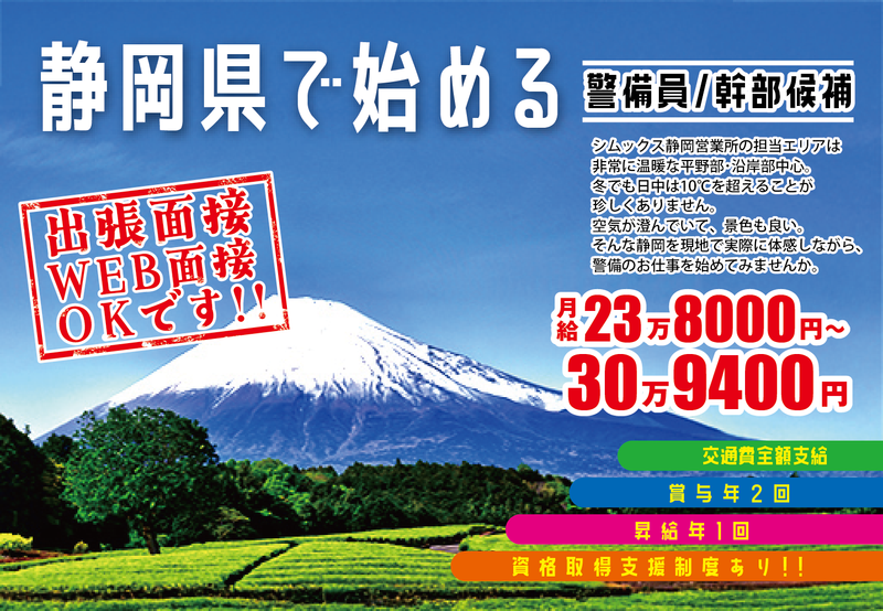 仕事内容 【出張面接・WEB面接OK!!新天地、静岡で働く!】 【スキル・キャリアアップが目指せる!幹部候補募集!】 幹部候補として、警備員の配置や教育、指導などをお願いします。 仕事を覚えるまでは、事前研修と現場でしっかりトレーニングできますので、 未経験の方も安心してくださいね! <主な仕事内容> ・配置…依頼に応じて警備員を現場に配置します。 ・教育…教育担当として、研修などを実施します。 ・指導…配置先を巡回し指導などをします。 ◆飲食・販売などのサービス業、製造業など異業種からの転職も大歓迎! ◆車通勤OK(駐車場有) ◆昇給、賞与あり! 【シムックスについて】 創業から50年続く警備会社です。 本社は群馬県ですが、関東・静岡を中心に営業所を展開しています。 安定性を抜群!新規事業にも積極的に取り組んでいます。