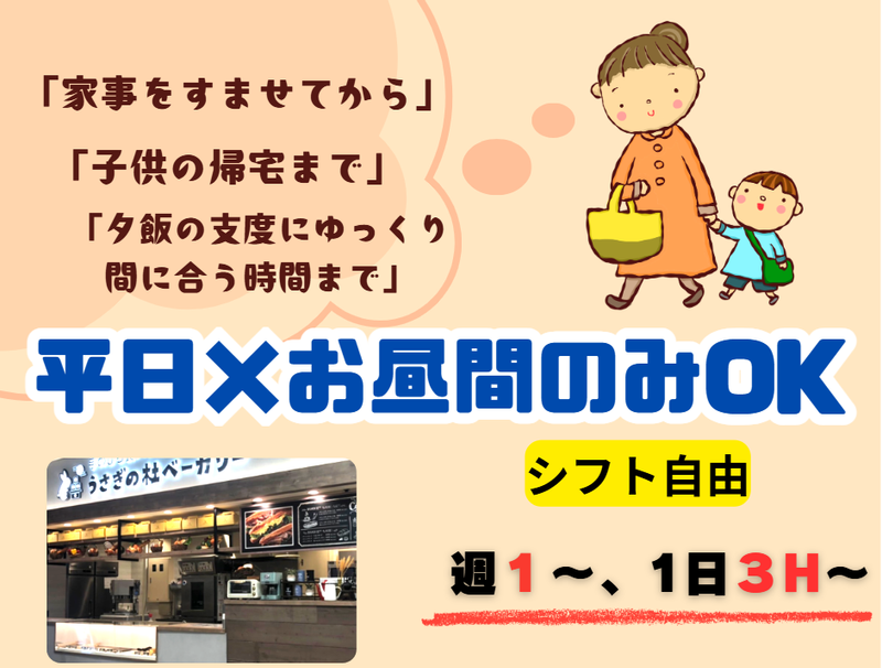 仕事内容 *週1日~、1日3h~OK! *平日のみもOK *週末のみもOK *主婦(夫)さん、学生さん活躍中! *研修バッチリ!未経験も大歓迎 手のひらサイズのかわいい キューブ型の食パンと、 オーガニック珈琲を提供する うさぎの杜ベーカリー。 今回は、 パン作りスタッフの募集! 未経験の方も大歓迎! 基本からシッカリ学べる 研修をご用意しています。 飲食が初めてという方はもちろん、 バイト自体が初めての方も、 久しぶりに仕事をするブランク有な方も 安心して飛び込んできてくださいね! <お仕事内容> パンづくりのほか、 ピザトーストづくりなど カンタンな調理や、 洗い物・商品袋詰め・陳列 などもお任せします* まずはパン生地に ゴマやハーブを乗せるなど 簡単な盛り付けから はじめていきましょう! ==================== "プライベート優先"でOK! ==================== 週1日~、1日3時間~勤務OK! 何曜日でも週1回から働けます◎ ランチのみ・ディナーのみなど 時間を固定にすることも可能! パンが好きな 家事の合間に働きたい主婦(夫)さん 部活、サークルも楽しみたい学生さん、、 他のお仕事と両立させたいフリーターさん、 どんな方の希望にもマッチします◎ もちろん、しっかり稼ぎたい フルタイム希望の方も大歓迎ですよ! ラピタ本店内なので、お仕事前後に お得にお買い物も出来て便利!