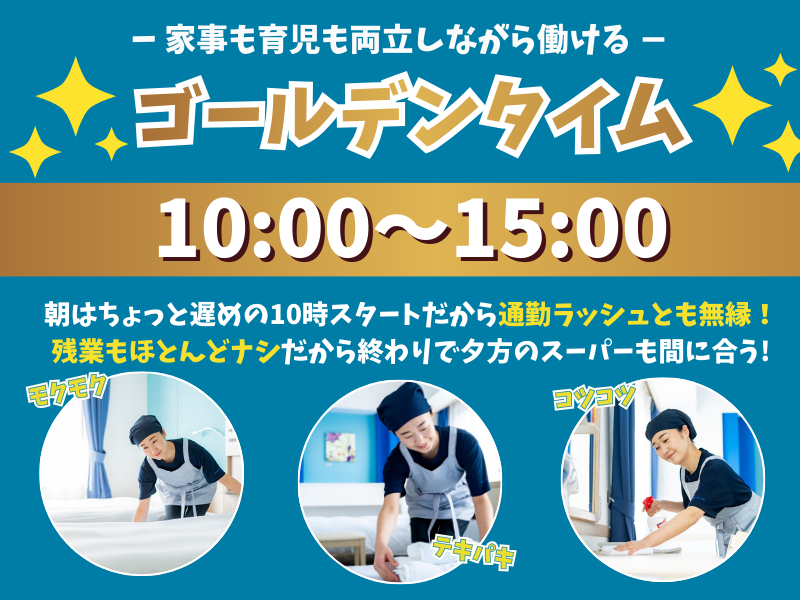 仕事内容 家事も、自分時間も、ちょっと収入も。 =================== 「子どもが学校に行っている間だけ働きたい」 「週2・3日なら働ける」 そんな主婦さんにちょうどいい、 10時〜15時の客室清掃ワークです。 ⏰ 家庭と両立しやすい働き方  ̄ ̄ ̄ ̄ ̄ ̄ ̄ ̄ ̄ ̄ ̄ ̄ ̄ ̄ 勤務は【10:00〜15:00】の5時間だけ。 朝は家事を済ませてから出勤、 夕方前には帰宅できます。 ✨ 無理なく家計にプラス  ̄ ̄ ̄ ̄ ̄ ̄ ̄ ̄ ̄ ̄ ̄ ̄ ̄ ̄ 短時間でも、 自分のためや子どもの将来のために 少しずつ貯められる収入になります。 ✨ 接客なし・モクモク作業  ̄ ̄ ̄ ̄ ̄ ̄ ̄ ̄ ̄ ̄ ̄ ̄ ̄ ̄ ベッドメイクや掃除機がけなど、 シンプルな客室清掃のお仕事。 基本は1人作業なので、 人に気を遣わず自分のペースで働けます。 【応募方法】 ✨直接採用担当とお話ししたい方 →電話での応募大歓迎! 082-504-1045 までお気軽にお問い合わせください! ✨【応募】ボタンから応募の方 →エントリー後、担当者からご連絡差し上げます。