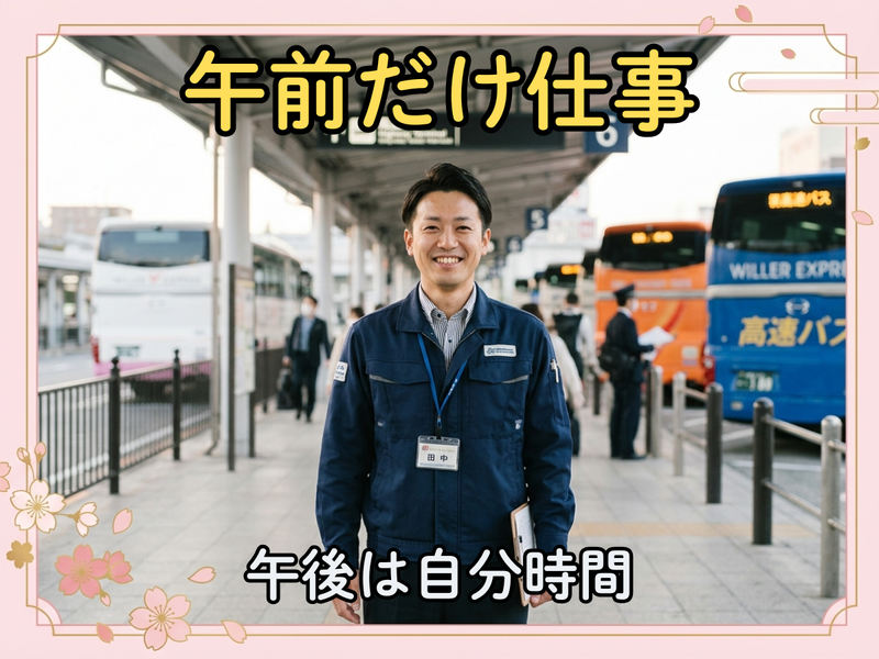 仕事内容 \ ここに注目! / ◆週2日~シフト相談、お昼までのお仕事 ◆高時給1250円、給与の週払い可能 ◆適度に身体を動かすお仕事です ◆年齢不問、地元で活躍したい方歓迎 ◆個室寮完備!遠方の方も歓迎します 勤務地のバスターミナルは 365日稼働しています。 ガッツリ収入を得たい方はもちろん、 プライベートとの両立を重視したい方も 自分らしく働ける環境でお迎えいたします。 ―――――― 仕事内容 ―――――― 高速バスのターミナルにて、 お客様のご対応を行います。 ・荷物の積み降ろし ・お客様のご案内 など、業務自体はシンプル。 丁寧に荷物を扱える方や お客様に笑顔で対応できる方が 輝くお仕事になります。 まずは先輩たちのサポートから始めて、 徐々に業務を覚えてください。 自信を持って独り立ちできるまで、 何度でも丁寧にお教えします。 ――――――――――――― 長く安定して働ける職場 ――――――――――――― 週2日~シフト相談が可能ですし、 お昼までの固定時間勤務です。 生活リズムを崩すことなく働けます。 また地元の方だけでなく、 遠方からの応募も歓迎します。 寮完備のため、遠方からの応募・ 住み込み希望の方も安心です。 無理なく、長く働ける環境で お迎えいたします。 ――――――――― 弊社のモットー ――――――――― 【安全の企業・安心の企業・信頼の企業】 が弊社のモットーです!! 警備業を設立してから30年以上の実績を持つ当社。 安定した環境で一緒に働いていただく 仲間を募集しております! 是非、お気軽にご応募下さい! あなたのご応募をお待ちしております!
