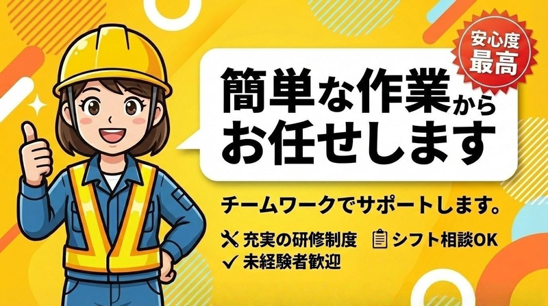 求めている人材 ✅学歴不問(中卒・高卒OK) ✅フリーターOK ✅経験不問 ✅未経験OK 【下記のような経験ある方からも応募頂いています】 ・飲食店でのキッチン ・介護福祉関連 ・内装解体 ・リフォーム工事関連 ・舗装会社関連 ・建築業関連 ・交通誘導・警備員 ・スポーツ関連職 ・引っ越し作業 ・物流倉庫での仕分ピッキングなど