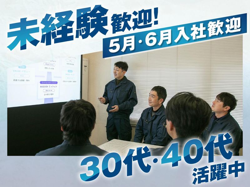 職場環境 創業50年超の安定企業で、 30~40代の男性スタッフが中心。 画像のとおりチームワークが良く定着率◎ 社長も現場に顔を出す温かい社風です。 喫煙所:喫煙所あり(屋外)