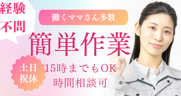 仕事内容 玉村町にある会社でのお仕事です。 組立・検査のお仕事ポイント! ・15時迄もOK※就業時間相談可 ・冷暖房完備できれいな職場 ・小物製品のセットやボタン押し ・組み立て・梱包のお仕事 時給1,100円/土日祝休み/かんたん軽作業 【職場環境】 冷暖房完備できれいな職場 ~50代の女性活躍しております! 9時~15時までのお仕事なので 小さなお子さんがいる方も安心 勤務時間は9時~17時でも相談可能です。 【経験者大歓迎】 工場や倉庫内作業などのお仕事の経験がある方大歓迎です! 【ここがPoint】 車通勤OK バスや電車の時間を気にせず快適に通勤できます! 遠方からの通勤もラクラク 週払いOK 急な出費があっても安心ですよ ご不明な点がございましたら お気軽にお問い合わせください。 たくさんのご応募お待ちしております。 玉村町にお住いの方はもちろん、藤岡市・伊勢崎市・前橋市・本庄市など、群馬県・埼玉県にお住いの方におすすめ! ご自宅から少し距離がある方も、交通費支給なので安心してお仕事できます ご不明な点がございましたらお気軽にお問い合わせください。 たくさんのご応募お待ちしております。
