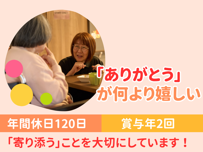 仕事内容 ✅ 夜勤なし!早・遅番限定シフト ✅ ブランク歓迎◎20代~50代が在籍 ✅ 希望休OKで予定も立てやすい ✅ 自分のペースでスキルも再確認できる ★☆★ー 介護スタッフ募集(早番・遅番限定) ー★☆★ 特別養護老人ホーム 「やすらぎミラージュ」での介護業務を お願いします。 日勤帯のチーム体制で、ご利用者の生活を サポートします。 記録業務はPC入力&スマホ連携で 効率化されており、ケアに集中できる 環境です。 <具体的には…> ・食事・入浴・排泄の介助 ・お散歩やレクリエーションの補助 ・記録入力(PC・スマホ対応) ・施設行事のサポート ・スタッフ間の申し送りや声かけ連携 1日の流れ(遅番例) 10:30 出勤・申し送り確認 12:00 昼食準備・介助 14:00 レクリエーションや外出付き添い 17:00 夕食対応・記録入力 19:30 退勤 ー★☆★ ⭐ー 早番・遅番だけの勤務で 無理なく生活リズム安定 ー⭐ 夜勤は一切ナシ。 勤務は早番(7:00~16:00)か 遅番(10:30~19:30)の2シフト制なので、 朝・夜の生活リズムを乱さずに働けます。 旦那さんと子供の送り迎えが分担しやすく 空いた時間は自分の時間も大切にしたい方に 最適な勤務形態です。 ⭐ー 希望休OK! 家庭や予定に合わせやすい ー⭐ シフトは希望休制度があり、 事前に申請すれば家庭の都合や私用にも 柔軟に対応可能。 「この日は地域のイベントがある」 「病院の付き添いが必要」なども、 気兼ねなく相談できます。 プライベートと両立しながら、 安心して働き続けられる環境です。 <スタッフの声> 子どもが独立し、 「もう一度、しっかり働きたい」と 思うようになりました。 年齢のことも少し気になっていたけど、 ここは20代から50代まで幅広い スタッフがいて安心。何より、 “私の経験も誰かの役に立てる”と 感じられるのがうれしくて。 今は、早・遅番のリズムで無理なく 続けられていることに満足しています。