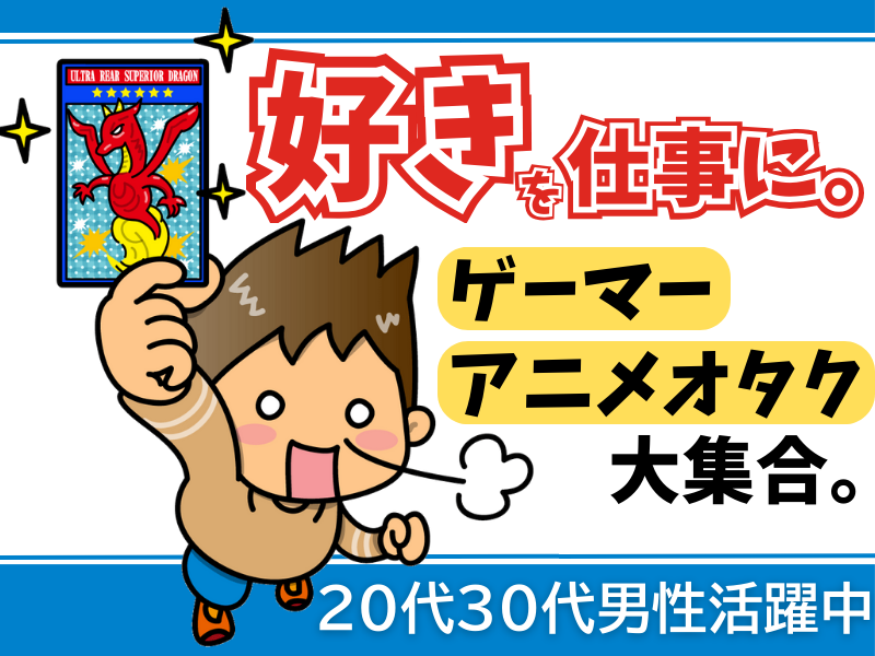 仕事内容 ✨ 店舗スタッフ募集 ✨ \ トレーディングカードが好きな方大歓迎 / ⭐ 専門的な知識を活かして働きたい方。 ⭐ ユーザー側から運営側になりたい方。 ⭐ 自分の好きなものに囲まれて働きたい方。 「フリーターだし、学歴も資格もないし…」 そんな心配は必要ありません! あなたの持つ**深い知識**こそが、ここで働く最強のスキルです。 “好き”を武器に――――― キャリアアップできるチャンスがあります! \ カードゲーム市場は今も拡大中。 / 大会やイベントも盛り上がり続け、 当社も店舗拡大の真っ最中! ⭐……………………………………………⭐ カード好きなら――――― 思わずワクワクする業務ばかり。 知識を活かせるだけでなく、 新しいスキルも手に入ります! ⏩ 接客・販売 トレカ&ホビーの商品知識を活かして お客様をサポート。 ⏩ イベント企画・運営 公認大会の進行やジャッジ、 非公認大会では景品や企画を考えて 盛り上げ役に! ⏩ 品出し・売場づくり どう並べればお客様の心に響くか、 知恵を絞る面白さがあります。 ⏩ 買取業務 査定も先輩が教えるので安心です。 ⭐……………………………………………⭐ # 好きなこと、履歴書に書いてOK # 趣味と仕事の二刀流 # 熱中していることを仕事にする カードゲーム好きが集まる場所。 そんな職場で一緒に働き始めませんか♪