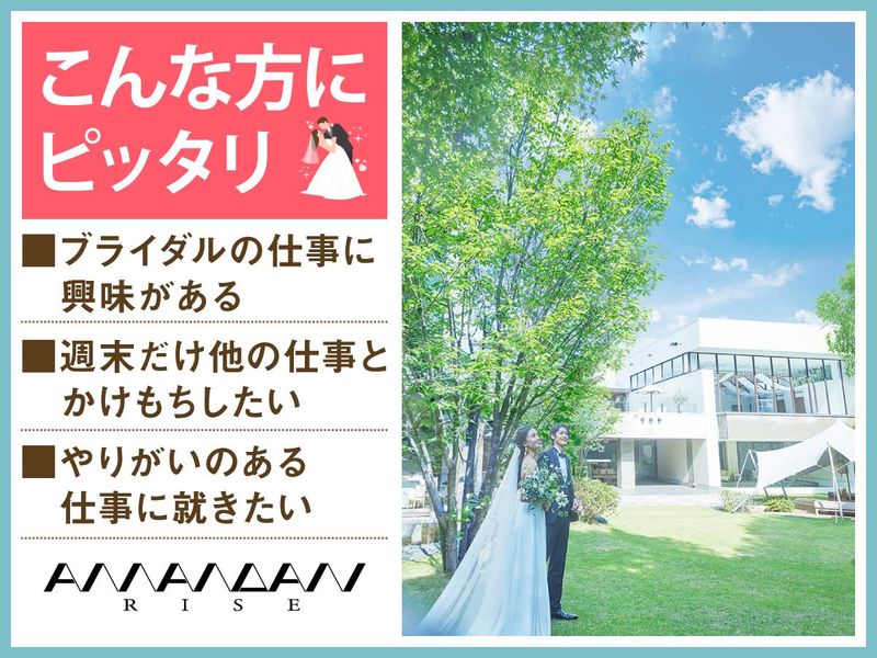仕事内容 *美しいスカイチャペルがある結婚式場* 感動いっぱいの結婚式を一緒にサポート♪ 週1~の柔軟シフトでWワーク・副業OK! フリーター・主婦パートさんも活躍中♪ 「人が喜ぶ姿が好き」「サプライズが好き」 という方必見!スキルや経験は一切不要♪ 一緒に素敵な結婚式を演出しましょう* アマンダンライズは リゾート感溢れるスカイチャペルや 優雅な大自然が美しいモダンな結婚式場。 ウェディングのお手伝いをするお仕事です◎ <主なお仕事内容は…> 結婚式場スタッフとして 次のお仕事をお任せ! ■会場の準備 ■お客様の上着や荷物のお預かり ■お席のご案内 ■結婚式のお料理・ドリンク提供 ※キッチン業務はありません◎ ―――――――――――――――― フリーター・社会人さん・主婦さんに オススメのポイントはこちら★★ ―――――――――――――――― ・家庭優先OK♪主婦(夫)さんも安心 ・週1日~1日4時間~OKで融通◎ ・本業が休みの土日だけ等大歓迎! ・かけもち・副業OK! ・絶品のまかないアリ(^^) まかないは本格料理人たちが 美味しい食材を使って作ってくれます♪♪ 現在はアルバイト・パート14名が在籍中! (高校生4名・大学生5名・フリーター20代3名・主婦30代~40代2名) ―――――――――――――――― 特別な1日をサポートするお仕事 具体的な仕事の流れは? ―――――――――――――――― ▶STEP.1 ミーティング 披露宴の流れやお料理について スタッフ間で事前に確認して 式中にバタバタしないようにします◎ ▶▶STEP.2 披露宴会場の準備 お席に置く名札や ゲストの方に渡す引き出物を確認したり グラスを磨いたりして準備します。 ▶▶▶STEP.3 お客さまのお出迎え 荷物をお預かりし、 待合室でドリンクをお出しします! ▶▶▶▶STEP.4 ホール業務 お席にご案内し、順番にお料理や ドリンクを提供します◎ ―――――――――――――――― 未経験者歓迎! みんなで助け合う雰囲気です ―――――――――――――――― 最初は結婚式の見学からスタート! 見学後は本番じゃないところで、 研修を実施します◎ 「子育てでブランクがあって不安」 「働くこと自体久しぶり…」 そんな方もご安心ください。 不安がなくなるまで、 スタッフ全員でサポートします◎