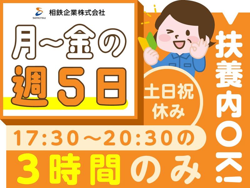 勤務時間詳細 【勤務時間】 17:30~20:30 (実働3時間、休憩なし) 【勤務日】 平日のみ週5日勤務 ★土日祝休み